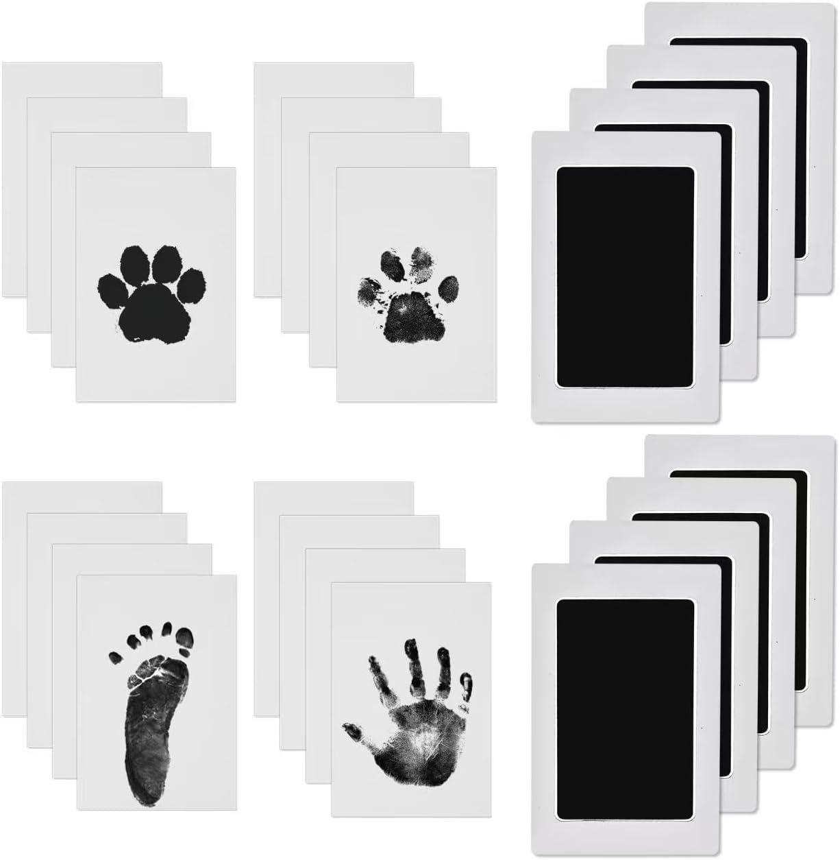 You get 8 inkless print pads and 16 imprint cards, plus the kit is positioned for baby handprints, baby footprints, and a dog pet paw print use case.