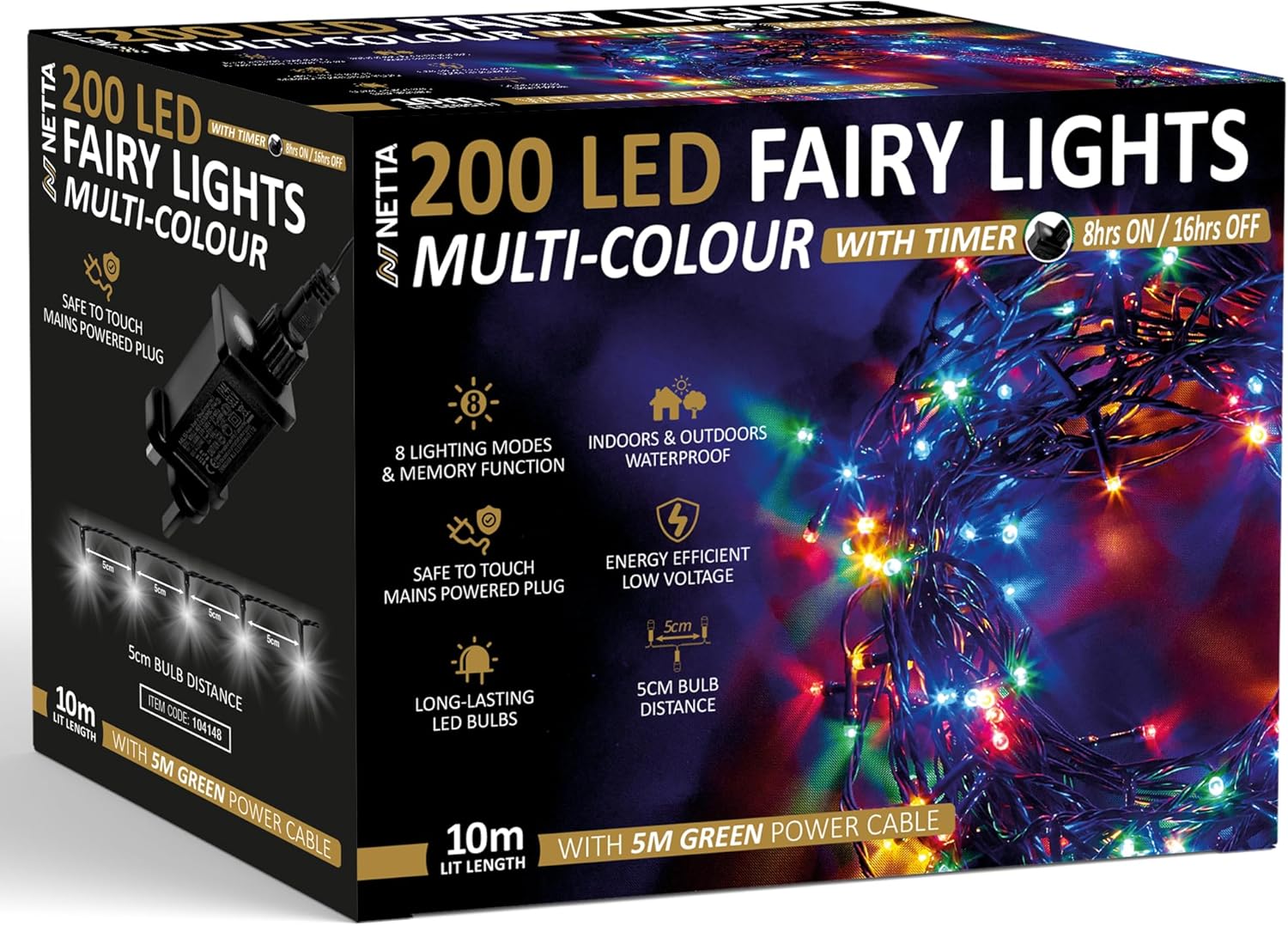 You get 200 multi-coloured bulbs arranged so that they sit 5cm apart. That spacing is pretty key for a “full” look on a tree or along a display, because it reduces the chances of obvious gaps.