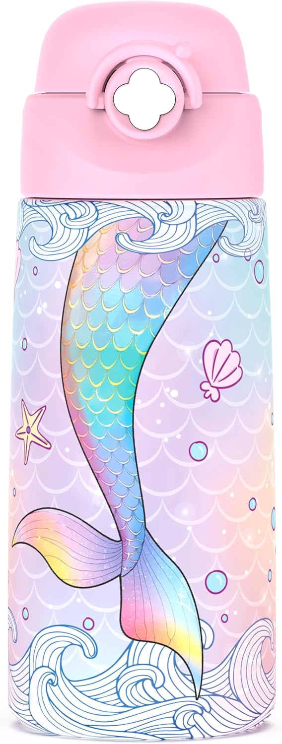 Ntswasd Girls Insulated Water Bottle (Mermaid) with Covered Pop-Up Straw, 500 ml