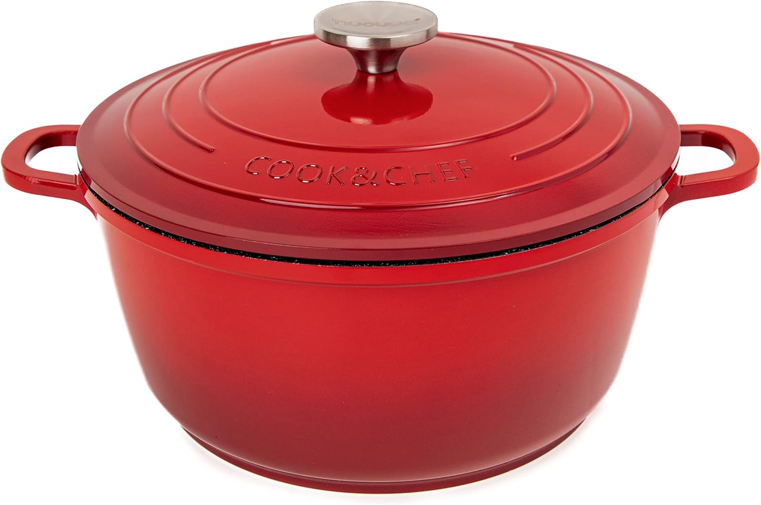 - Nuovva Shallow Cast Iron Casserole with Lid (3.7-Quart, 30cm) – Enamelled Non-Stick Dutch Oven Pot, Red