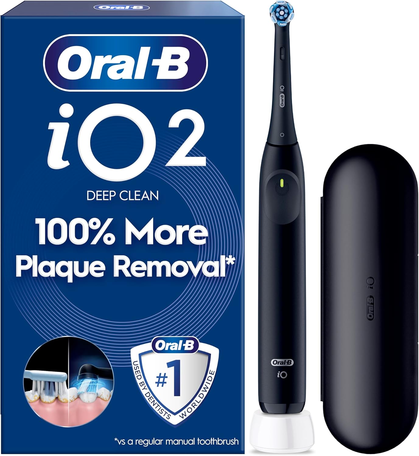 - Oral-B iO2 electric toothbrush for adults (Night Black) with travel case, gentle care brush head and 2-minute timer