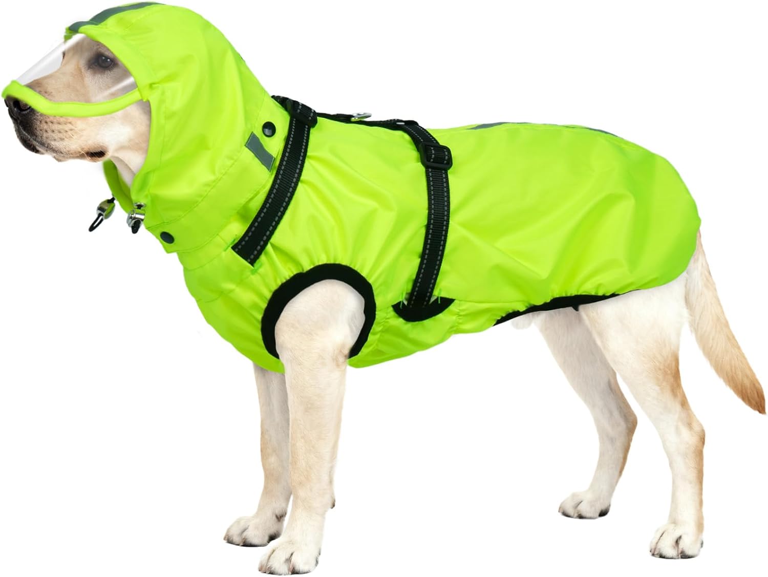 OUOBOB Dog Raincoat Waterproof with Reflective Strips, H-Harness & Detachable Hood (Neon Green, Size L)