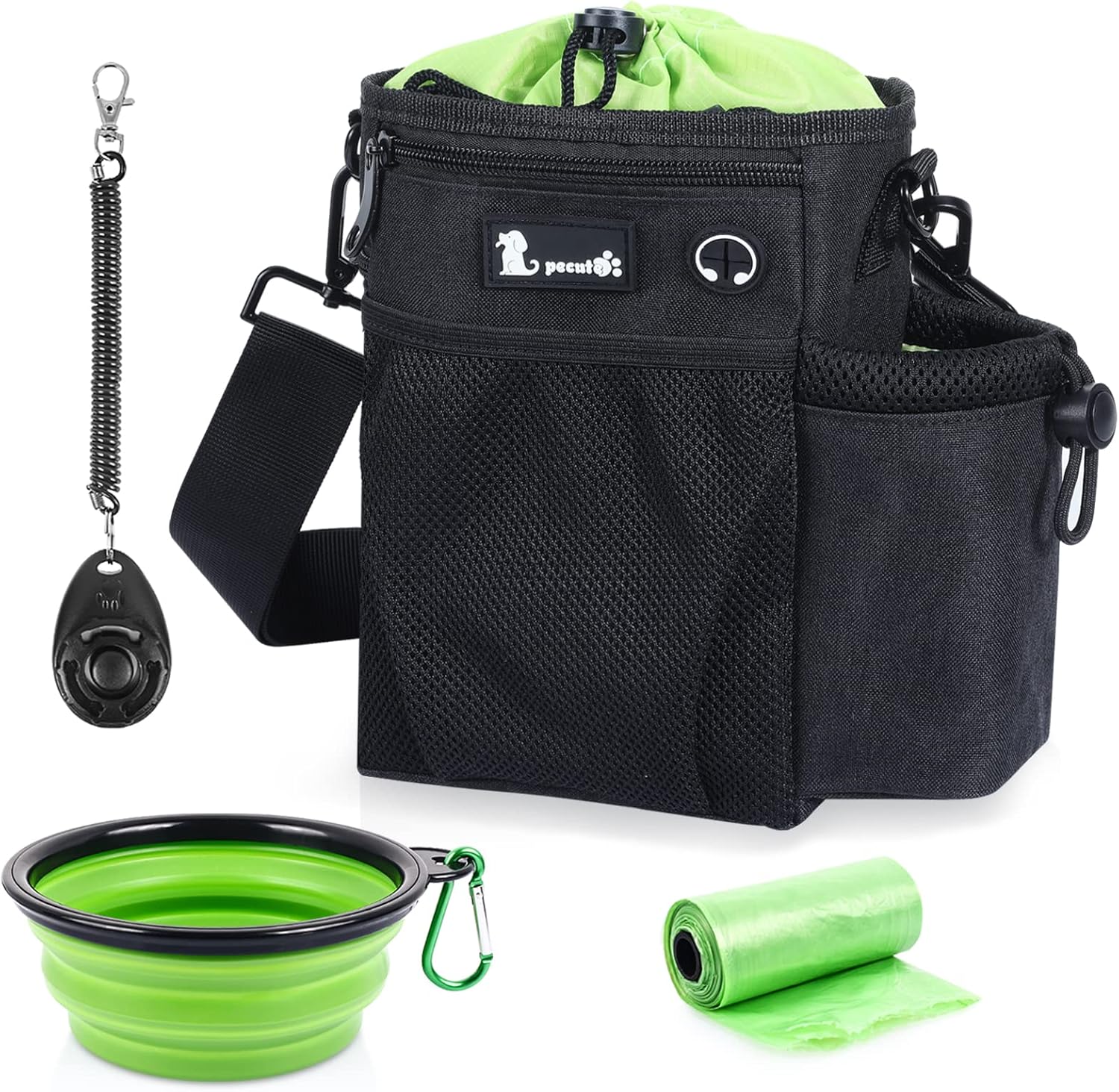 - Included in the items: one roll of 15 poo bags, one training clicker, and one collapsible bowl