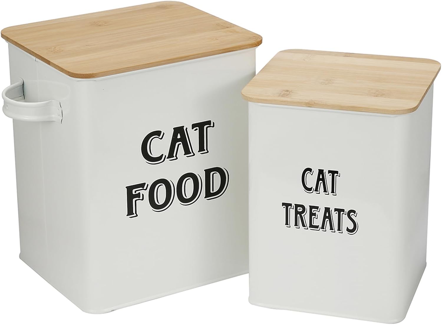The set includes two labelled storage canisters: a larger "CAT FOOD" container and a smaller "CAT TREATS" container, both described as steel food canisters with tight-fitting lids. There’s also a matching scoop included. The scoop is intended to hang on the side of the larger container, so you can scoop kibble or portion treats with less rummaging.
