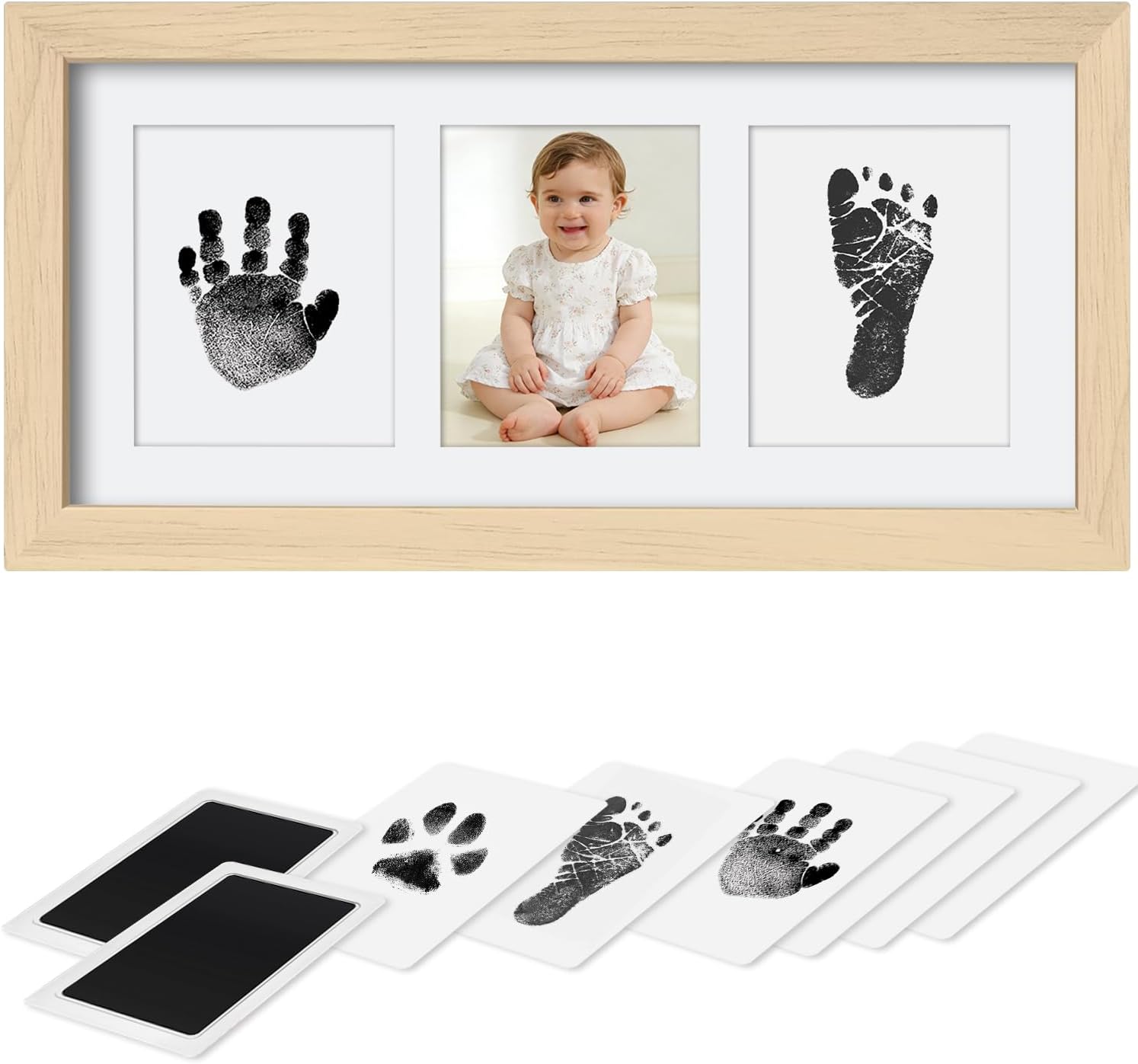 Example of a realistic use moment: you might do the handprint first, then take a quick breather, then follow with the footprint while your little one is in a relaxed mood. Once you’ve got the impression on the card, the frame becomes the natural next step, rather than leaving you with loose prints.