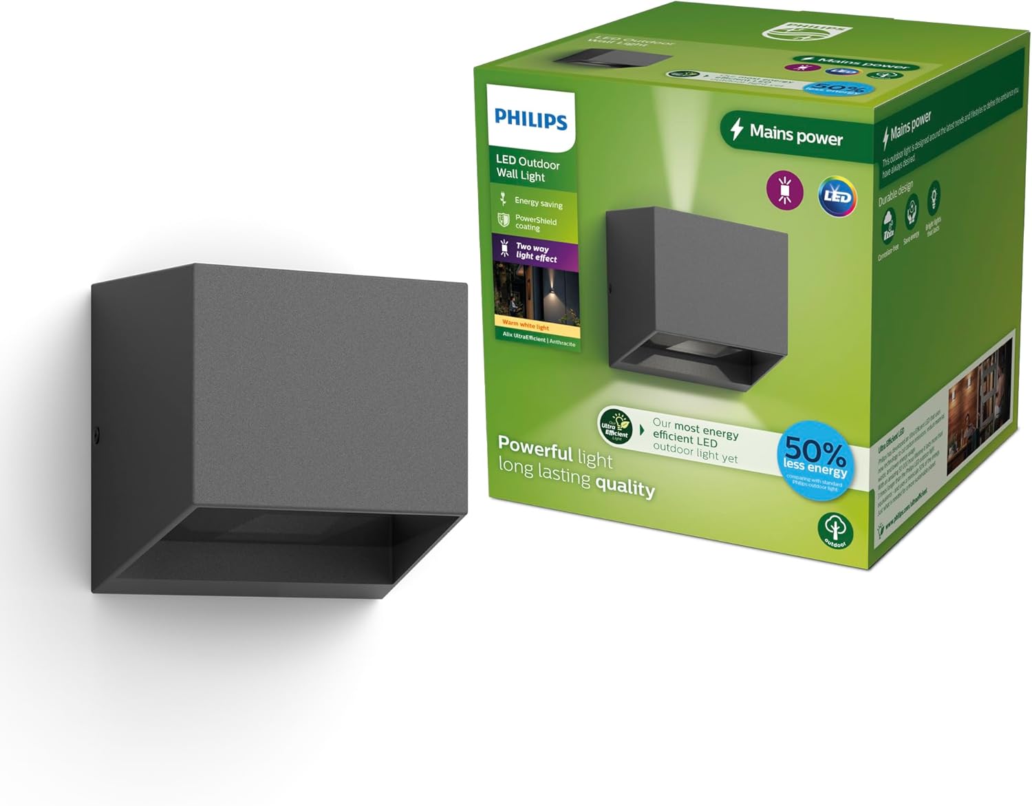 The PHILIPS Alix UltraEfficient Outdoor Wall Light provides warm, welcoming light for outdoor spaces while prioritising efficiency and durability. With energy savings at the core it draws on advanced LED technology to deliver a soft 2700K glow and high lumen output, helping you light paths and entrances without escalating bills. This model is built for longevity, featuring a robust powder coated finish designed to resist fading, scratches and rust across seasons. You’ll notice the practical blend of form and function, from the compact wall-mount design to the smooth, evenly distributed light that creates an inviting ambience around family gatherings or evening chats on the patio. The Alix family is engineered to be low-maintenance, with a long-lasting integral LED setup that reduces the need for frequent replacements and upkeep. If you value reliability and a warm atmosphere in outdoor areas, this fixture offers a sensible, durable solution that performs year after year. 💡 When you prioritise efficiency, you can count on the long life of up to 50,000 hours and a light quality that remains steady over time, supported by a protective Interpon coating that guards against corrosion and wear. In real-world terms this means less hassle and more time enjoying your outdoor space, not tending to fittings. Its style is understated yet modern, pairing well with contemporary facades and traditional exteriors alike. You get a dependable lighting option that prioritises value for money as well as resilience, suitable for entrances, porches and walls where a steady glow is desired. The design is purpose-built for outdoor use, with weather resistance and a high-quality finish that looks good in differing light conditions. This product is designed to be energy efficient, offering a high lumen per watt ratio that ensures ample illumination while keeping running costs modest. 🌙 The ambient warmth of 2700K helps create an inviting atmosphere for guests and everyday use alike, whether you are relaxing after a long day or hosting friends. The fixture’s light source is integrated, meaning fewer parts to manage and a more compact, streamlined appearance. In terms of practicality, the Alix provides dependable performance with a focus on durability and ease of maintenance, so you can install it with confidence and enjoy years of reliable lighting. You don’t need to worry about frequent bulb changes, making it a sensible addition to any exterior wall. Its classic silhouette and neutral anthracite finish blend seamlessly with most exterior décors, enhancing kerb appeal while remaining discreet when not in use. For those seeking a robust, energy-conscious outdoor lighting solution that balances character and practicality, the PHILIPS Alix UltraEfficient provides a strong match for daily use and weekend evenings alike.