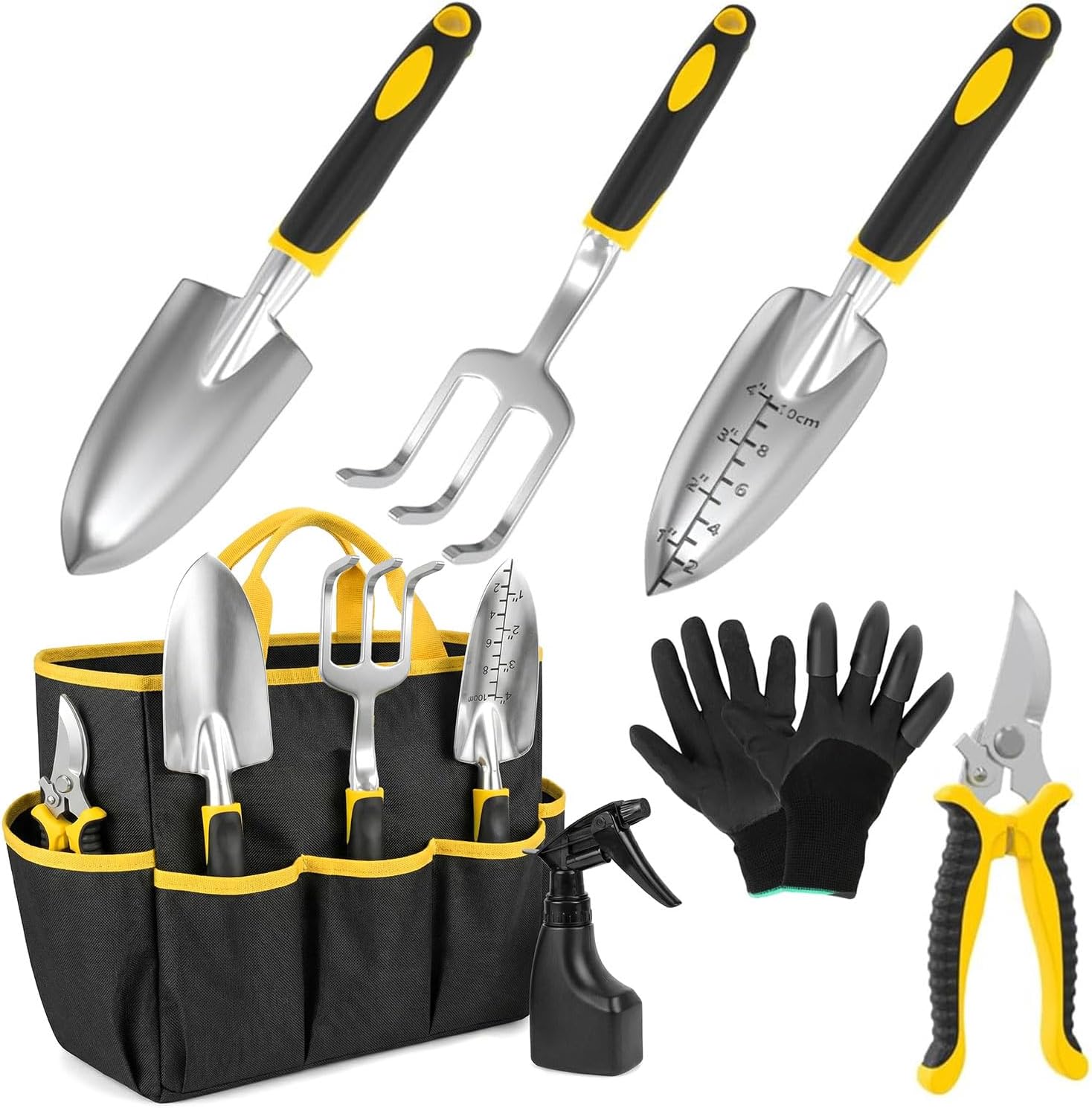 7-Piece Garden Tools Set (Stainless Steel) with Storage Tote Bag, Black & Yellow