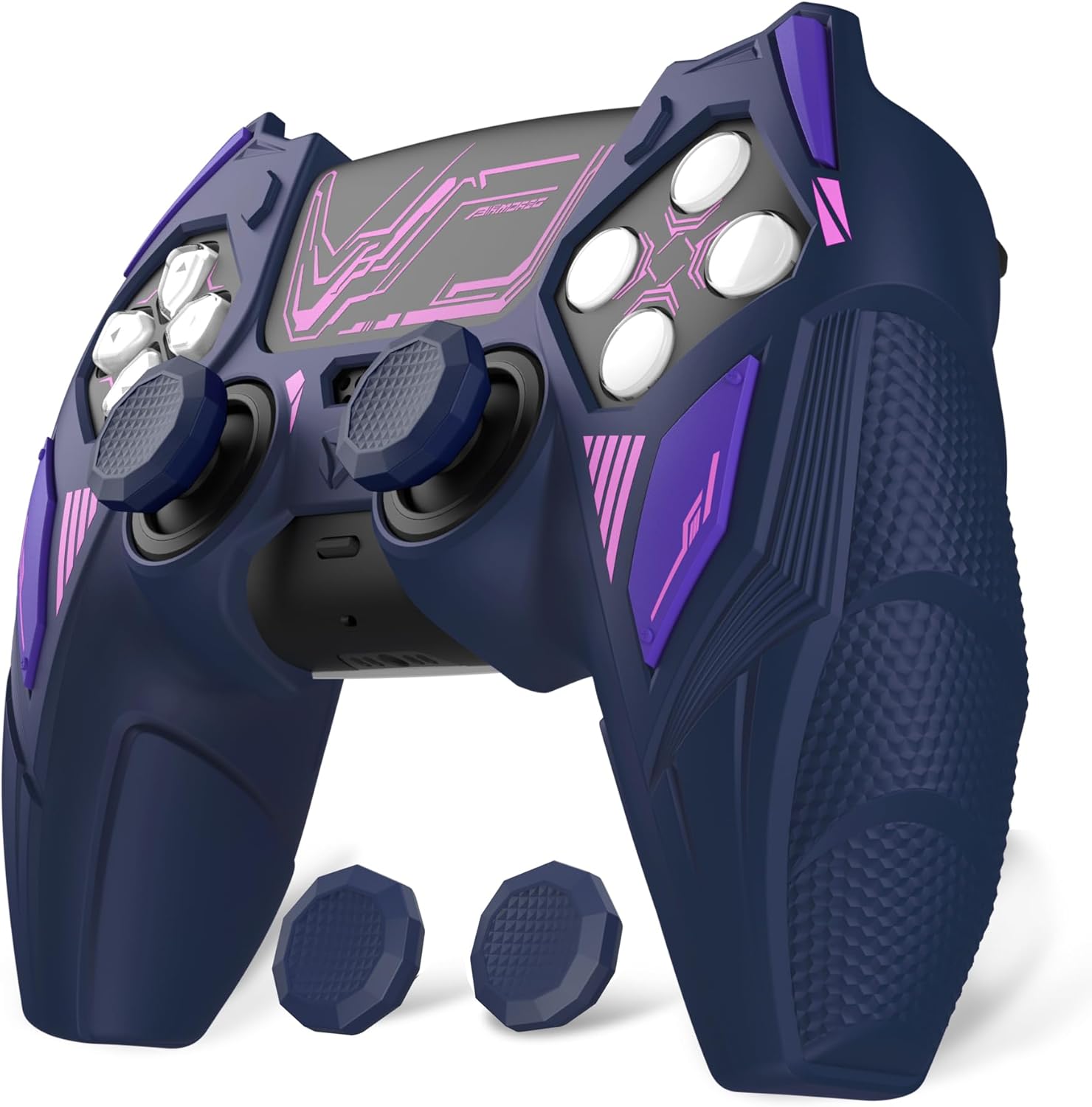 PlayVital Mecha Rhino silicone cover for PS5 controller with thumb grips & stickers (Midnight Blue & Purple)