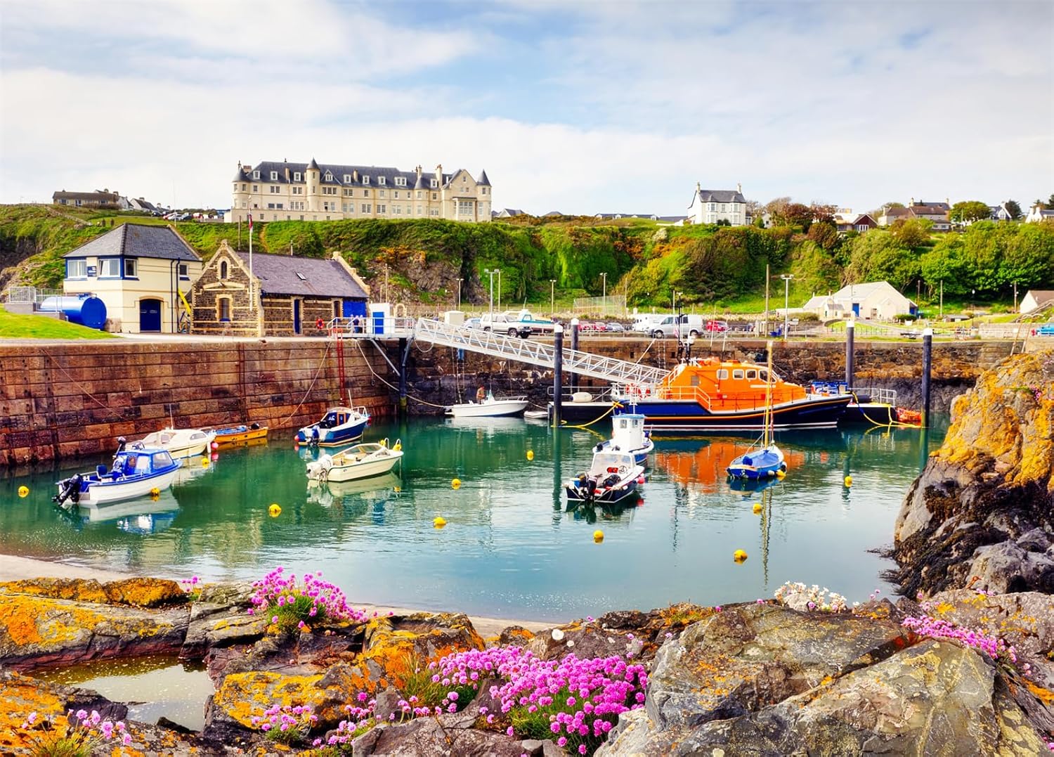 - Scene: Boats and a lifeboat in Portpatrick harbour in southwest Scotland