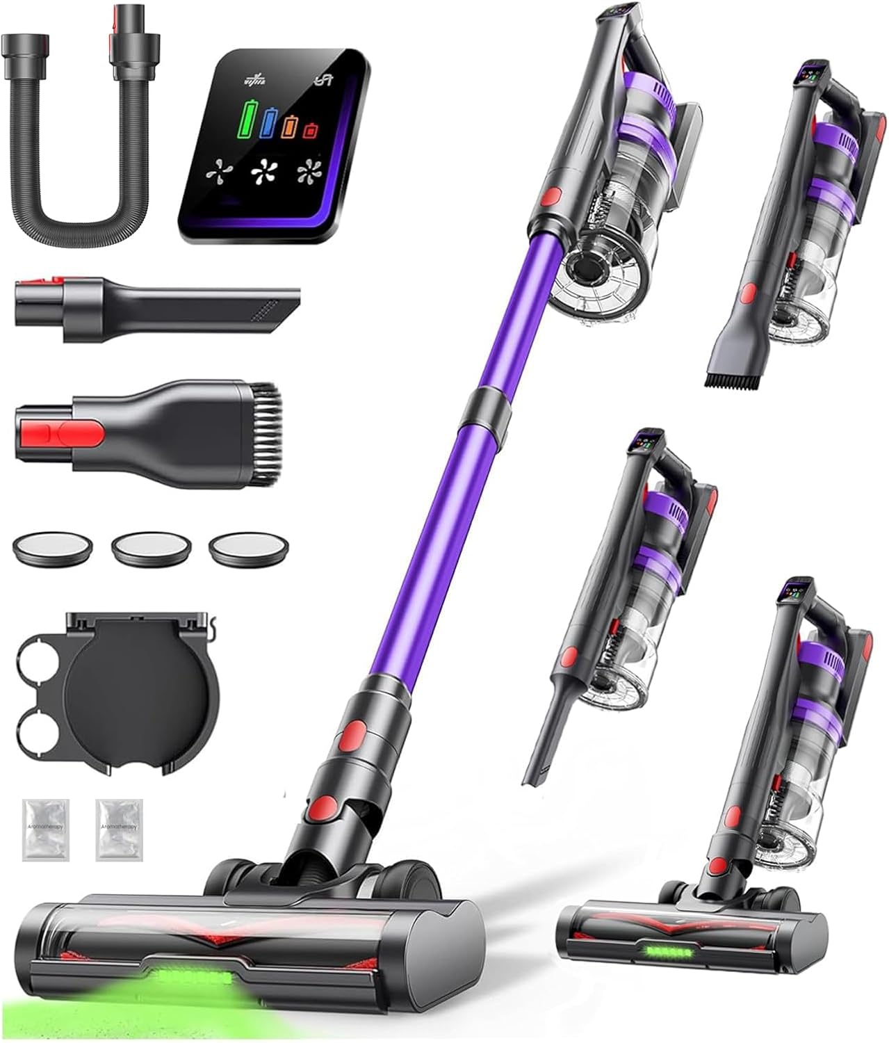 - INTETURE cordless stick vacuum cleaner with touch screen, 600W and up to 65 mins runtime