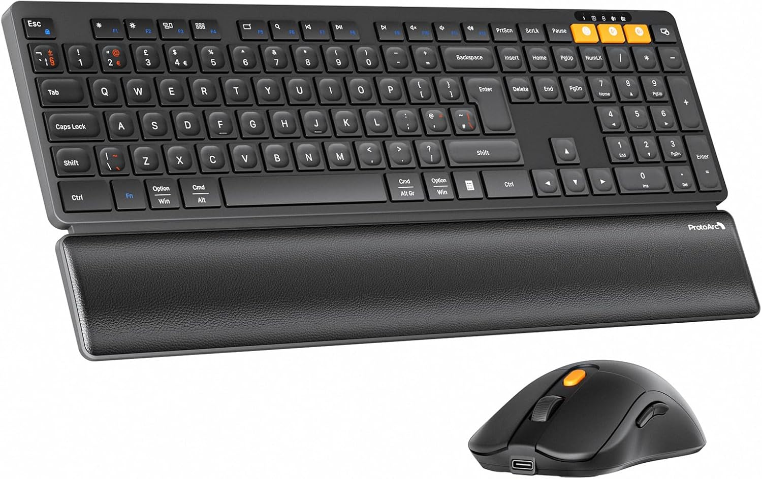 The ProtoArc KM60 is a full-size wireless keyboard and mouse bundle aimed at everyday desk work: typing documents, entering data, and doing office tasks without feeling tied to one device. The headline idea is simple—get a comfortable keyboard setup (including a built-in wrist rest and adjustable tilt) plus a quiet mouse—while keeping connectivity flexible with both 2.4GHz and dual Bluetooth.
