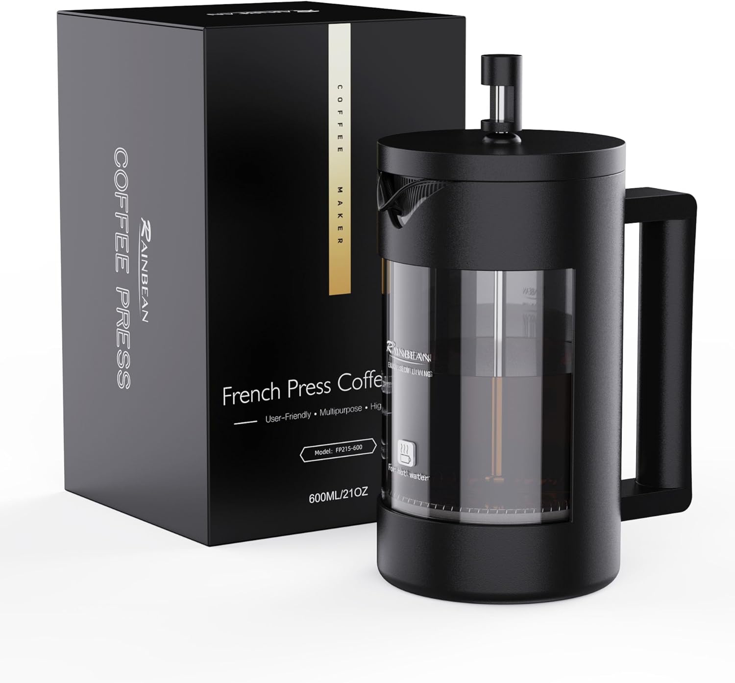 RAINBEAN Cafetiere Coffee Press 4 Cups/600ml — Glass French Press with 3-Level Filtration