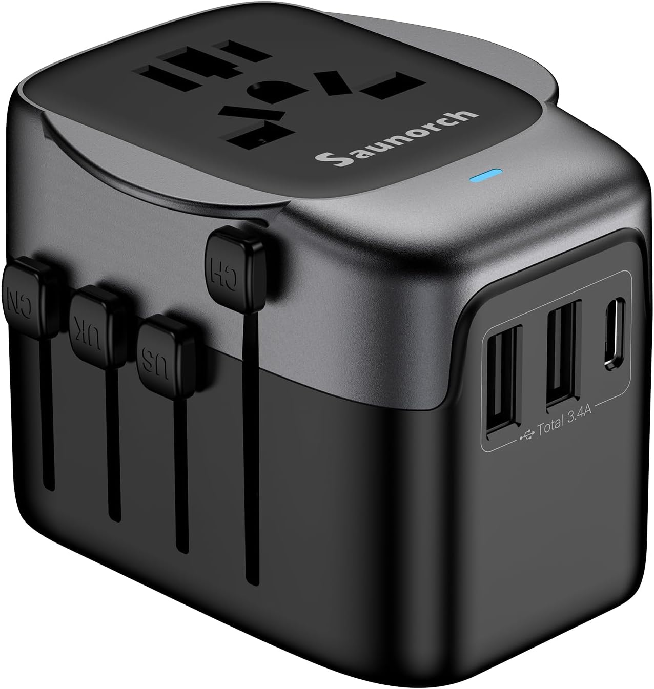 SAUNORCH Worldwide Travel Adapter with 2 USB-A & USB-C – universal plug for USA, UK, EU, AU (Thailand & 200+ countries)