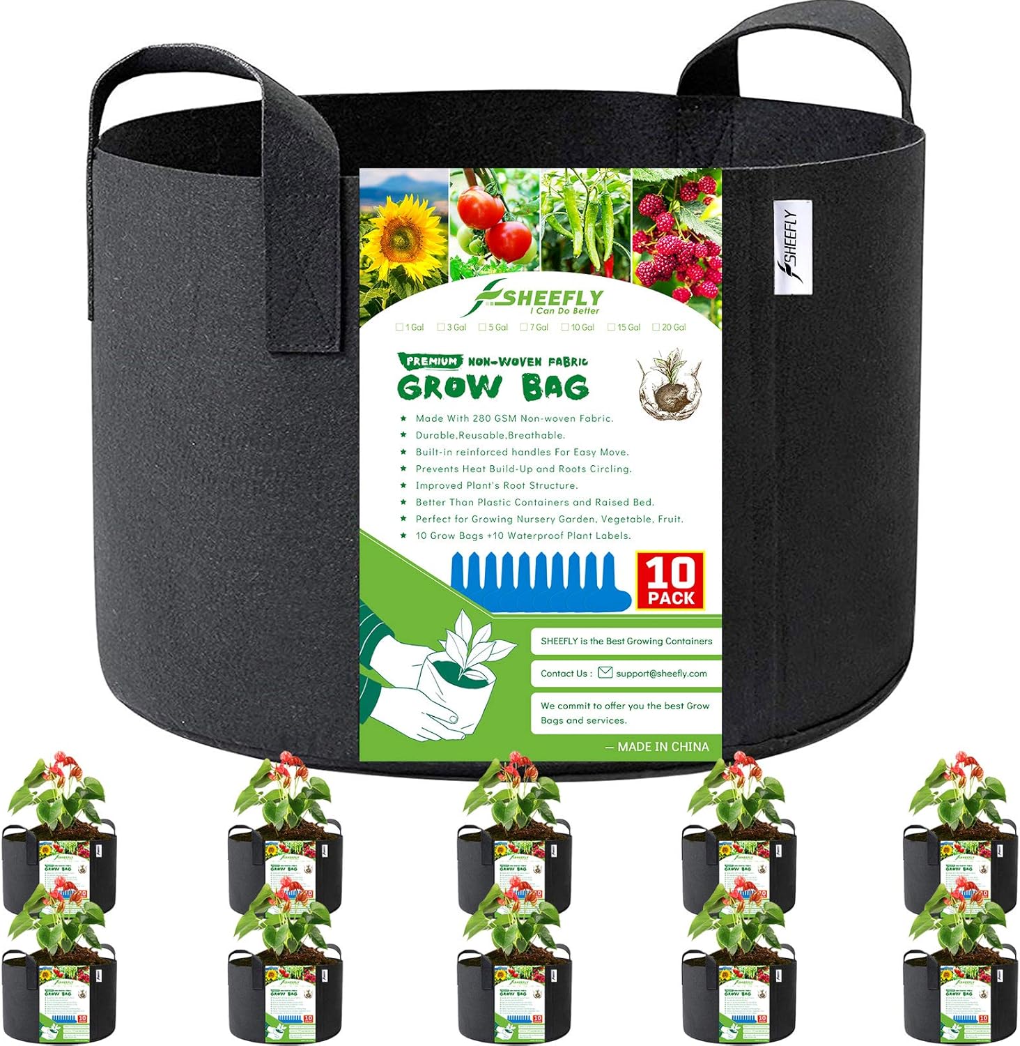 SHEEFLY 10 Pack 7 Gallon Grow Bags (300GSM) with Reinforced Handles and Plant Labels