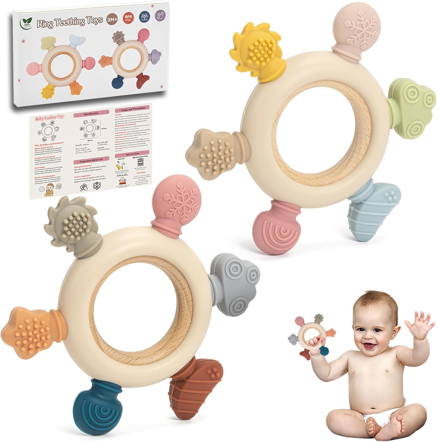 This gentle teether set brings simple soothing to the first months of chewing and exploring. These silicone teething ring toys combine soft food-grade silicone with a natural beech wood ring to help massage sore gums while encouraging tiny hands to grasp and play 🧸. The compact rings suit newborns through one-year-olds and are practical as a baby shower or Christmas gift.