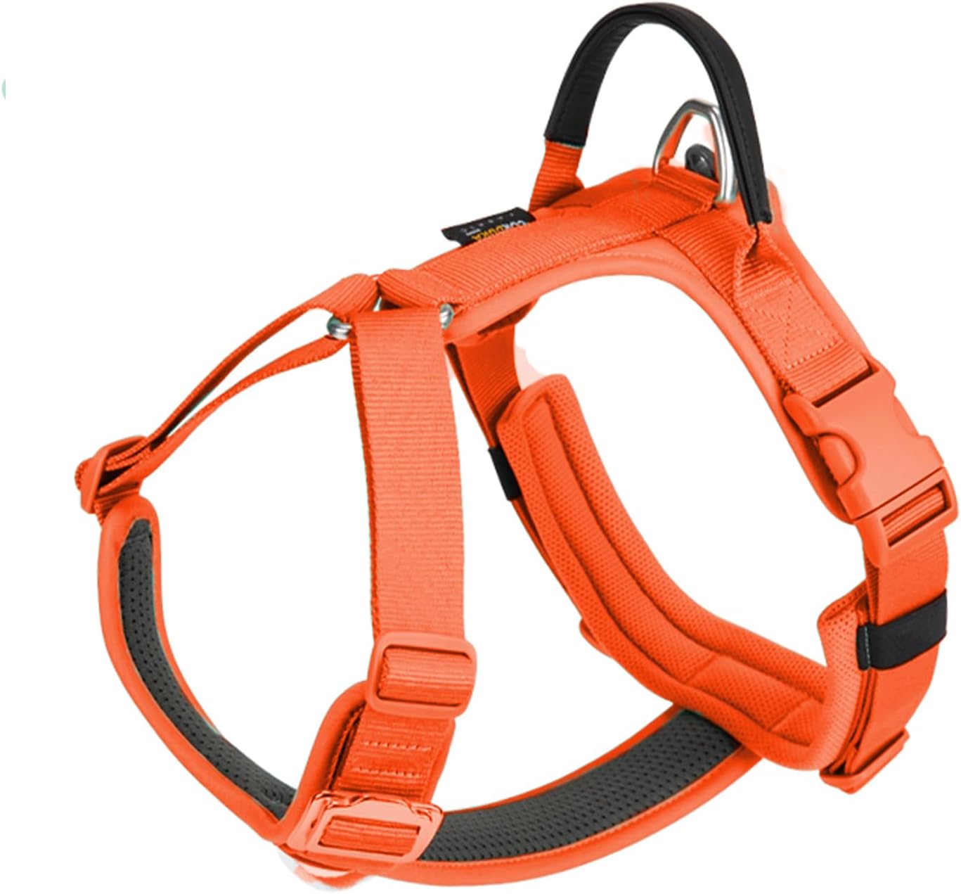 For control, the harness includes a sturdy aluminium alloy D-ring and a durable handle. The D-ring is a practical anchor point for attaching your lead, while the handle can help you keep your dog steady when you need a brief, firm hold (for example, when your dog spots something and you need to redirect quickly).