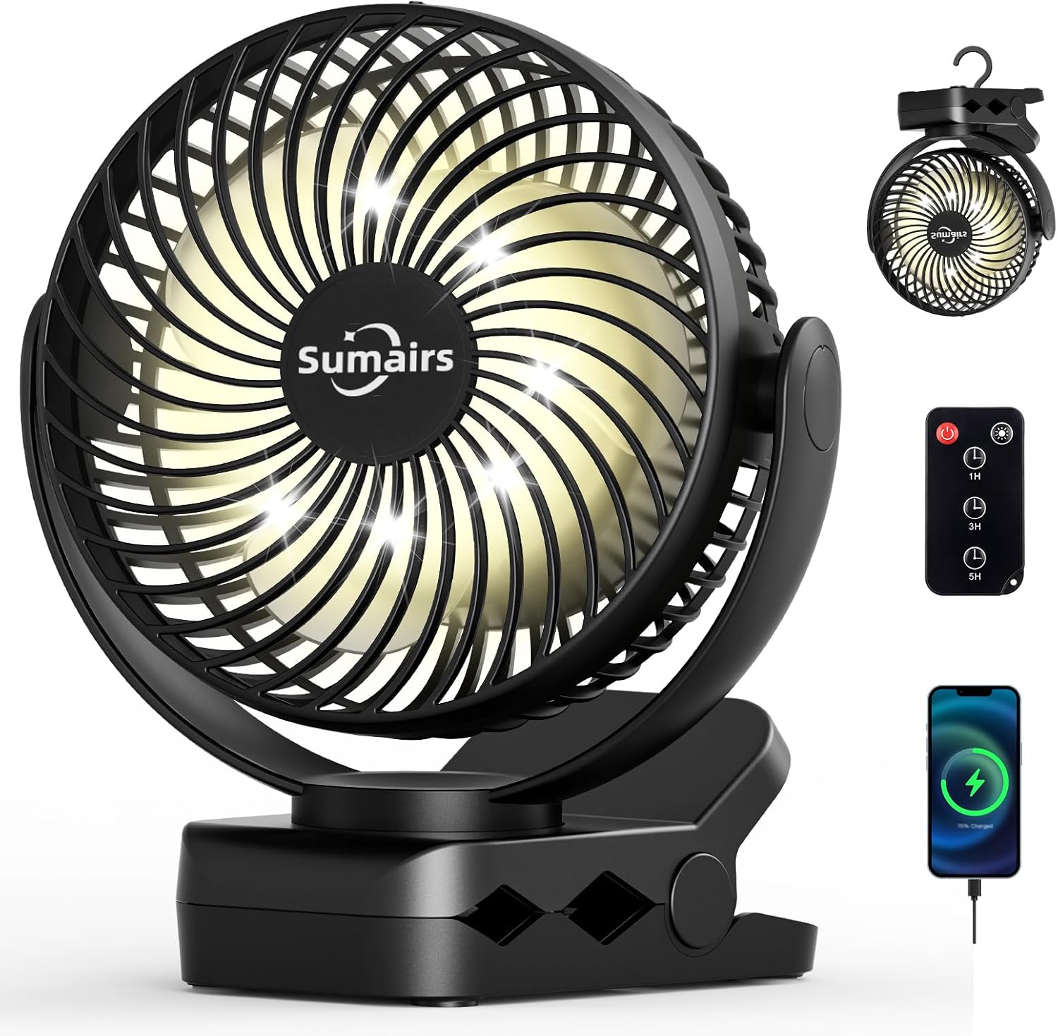 Sumairs 5.5" Clip-on Rechargeable Camping Fan (10,000mAh) with Remote, LED & Power Bank