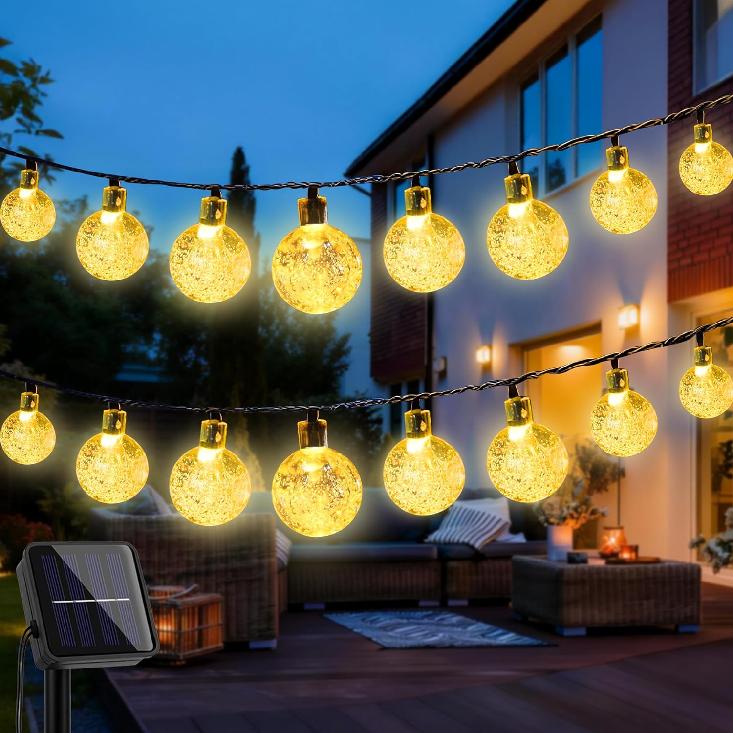 These solar string lights are designed to illuminate outdoor spaces with subtle, warm white glow. The 8 metre length provides flexible layout options along a path, around a gazebo, or across a patio, while the 2 metre lead cable makes placement practical. With 30 crystal ball style bulbs, the overall effect is delicate yet bright enough to create ambient lighting for evenings outdoors. Eight lighting modes meet varying needs from steady warmth to gentle twinkles, and a memory function recalls the last setting for convenience. Built for durability, the IP65 waterproof rating means you can use them in rain or snow without worry, while the energy efficient solar panel helps you keep costs down and reduce your carbon footprint. This kit blends aesthetics with practicality, turning decks, gardens, or terraces into welcoming spaces suitable for gatherings or quiet nights under the stars. 🌃 Note how the glass-like balls reflect light to enhance mood without overpowering your décor, making these lights a versatile accessory for year‑round use. The solar panel is updated for 2025 with improved efficiency, delivering reliable charging in a variety of British weather scenarios. Remember to orient the panel towards the sun for the best performance, and enjoy extended illumination after 4–6 hours of sun exposure. The overall package is lightweight yet sturdy enough to hold its form through breezy evenings, enabling simple hanging from trees, fences, railings, or garden features. You’ll appreciate the low maintenance design that requires no wiring, making installation straightforward even for first time buyers. If you’re decorating a patio, balcony, or camp setup, these lights provide a warm, romantic atmosphere with practical reliability. 🧭