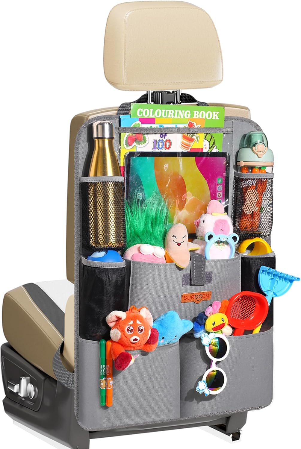 SURDOCA UPGRADED car seat organiser with tablet holder, 8 pockets and waterproof back protector