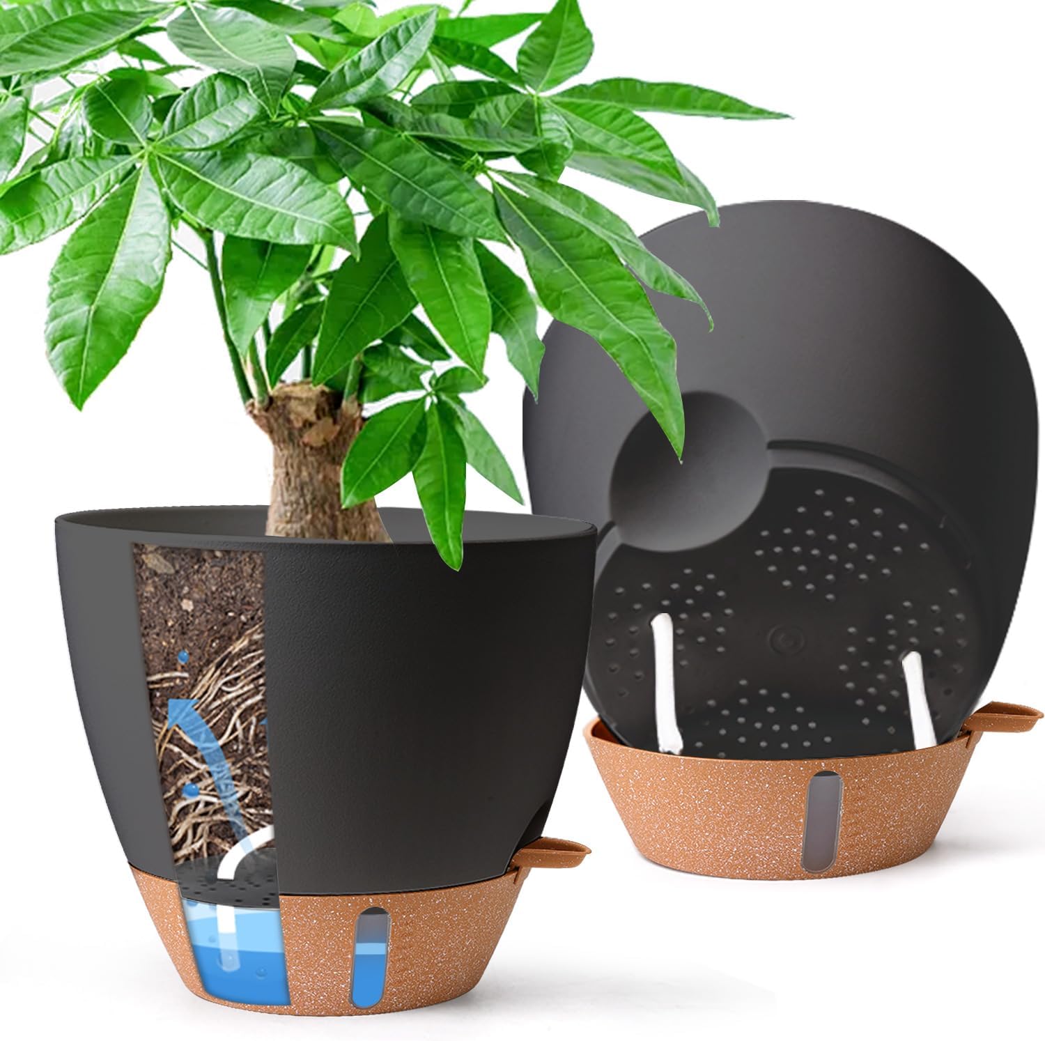 T4U 25cm Self Watering Plant Pots (2 Pack) with Water Level Indicator & Deep Reservoir, Black