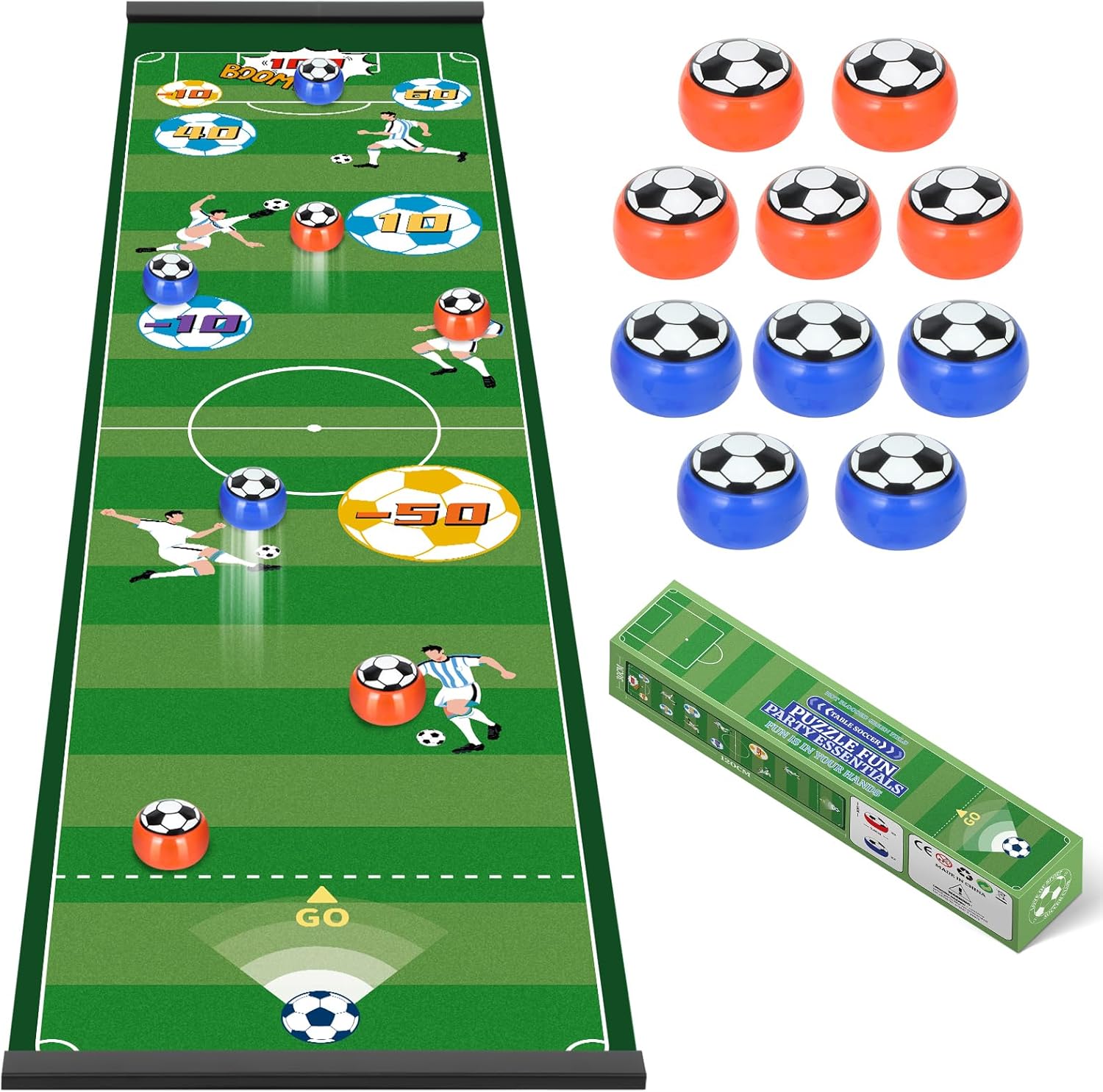 The package includes a foldable tabletop mat and 10 weighted “football” sliders. Each slider has an internal steel ball, which is intended to help give the momentum and glide you want for smooth runs across the pitch.