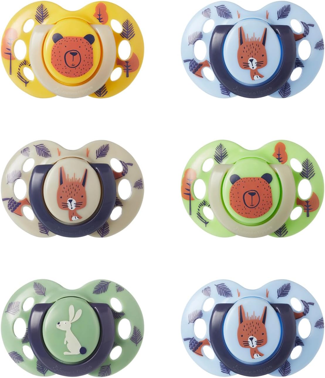 - Tommee Tippee Nighttime Soothers (0-6m), 6-pack BPA-free glow-in-the-dark symmetrical orthodontic dummies