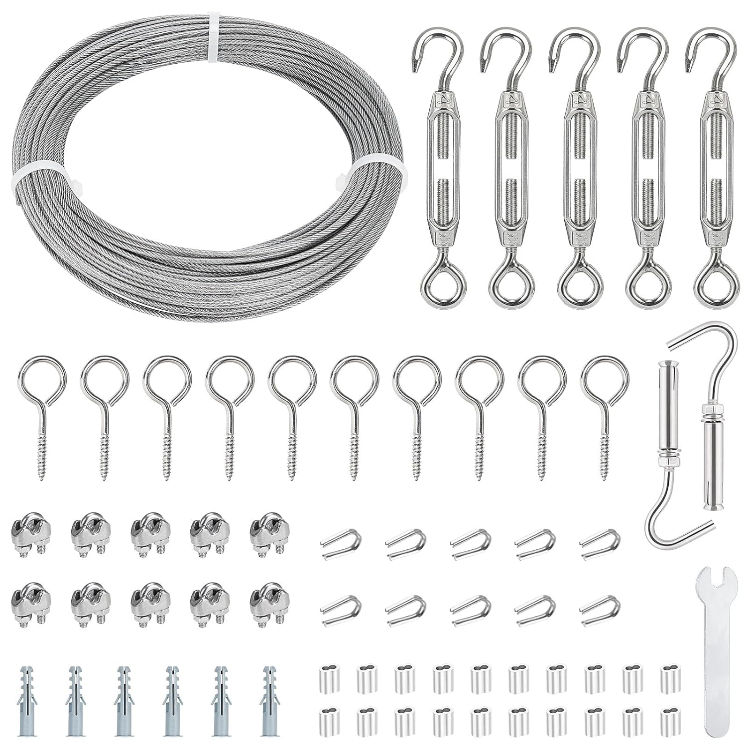 Included components (as stated): - 30M of 2mm PVC-coated wire rope - 5x M4 turnbuckles - 10x M4 screw eyes - 2x expansion hooks - 10x wire rope thimbles - 10x wire clamps - 20x aluminium crimping sleeves