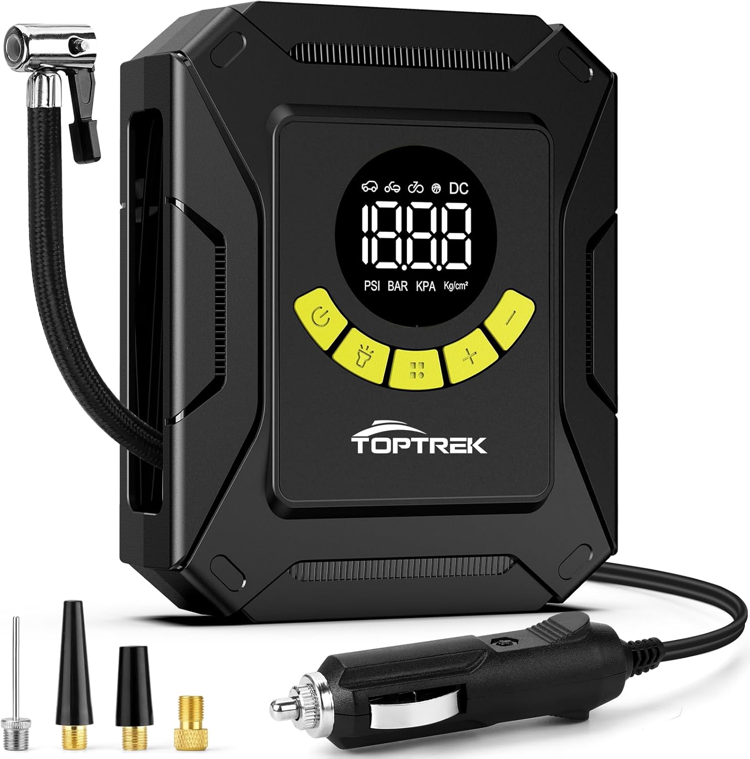 toptrek 12V Car Tyre Inflator (150 PSI) with Digital LCD, Preset Modes & Auto ShutOff