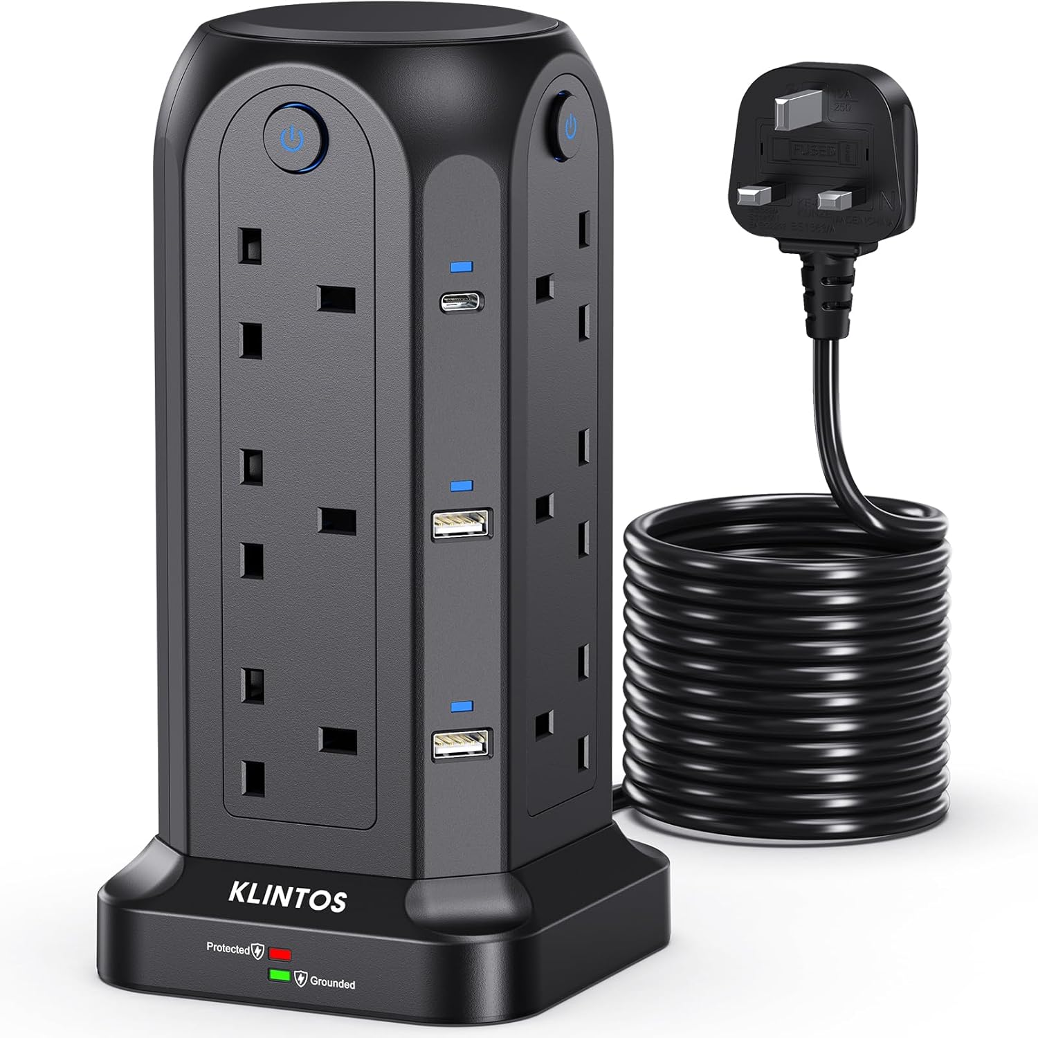 - Name: KLINTOS Tower Extension Lead 5M, 12 Way Surge Protection With 4 Individual Switches, 6 USB Slots (2 Type C & 4 USB A), Black
