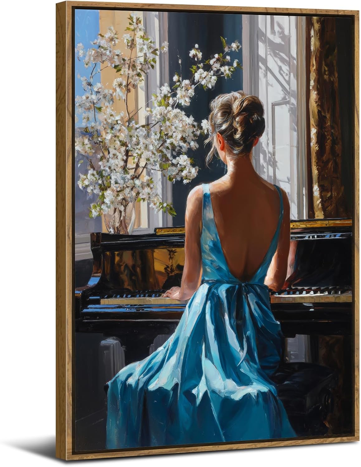 This Vintage Decor elegant woman wall art is a framed canvas print designed to bring a classical, music-themed look to a room. The picture shows an elegant figure in a flowing blue dress playing the piano by a window, which is exactly the sort of detail that can make a wall feel a bit more “curated” without needing to overhaul your décor.