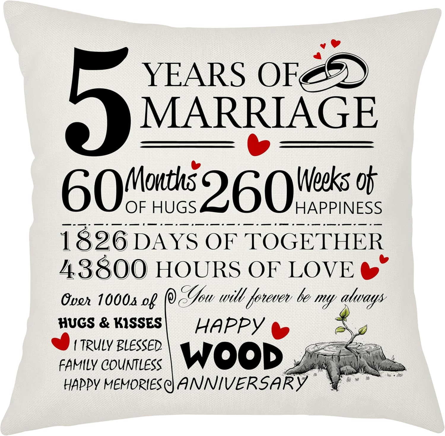 Weosan 5th Wedding Anniversary Wood Cushion Cover, 45x45cm (Pillow Case) – Keepsake Gift for Wife or Husband