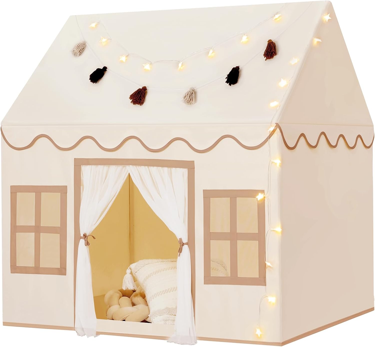 The padded mat adds immediate comfort, so children can sit or lie down without extra cushioning. The tassel garland gives a playful, decorative touch that helps the tent feel like a special space. According to the original description, the polyester fabric wipes clean easily, which keeps maintenance straightforward and limits disruption to daily routines.