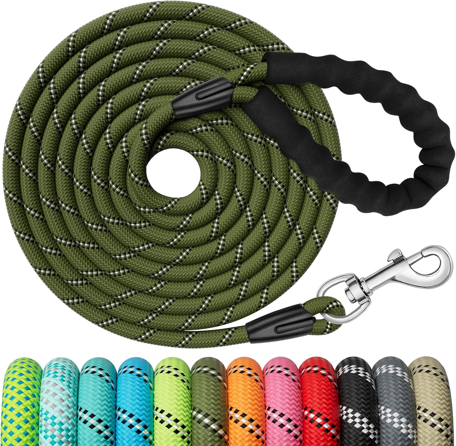 The rope is described as wear-resistant and not prone to easy fraying or disintegration, which matters because long leads take a bit of punishment: dragging, rubbing, and repeated outdoor use. There’s also a soft padded handle (EVA) intended to protect your hand from leash burns and give you a more comfortable grip.
