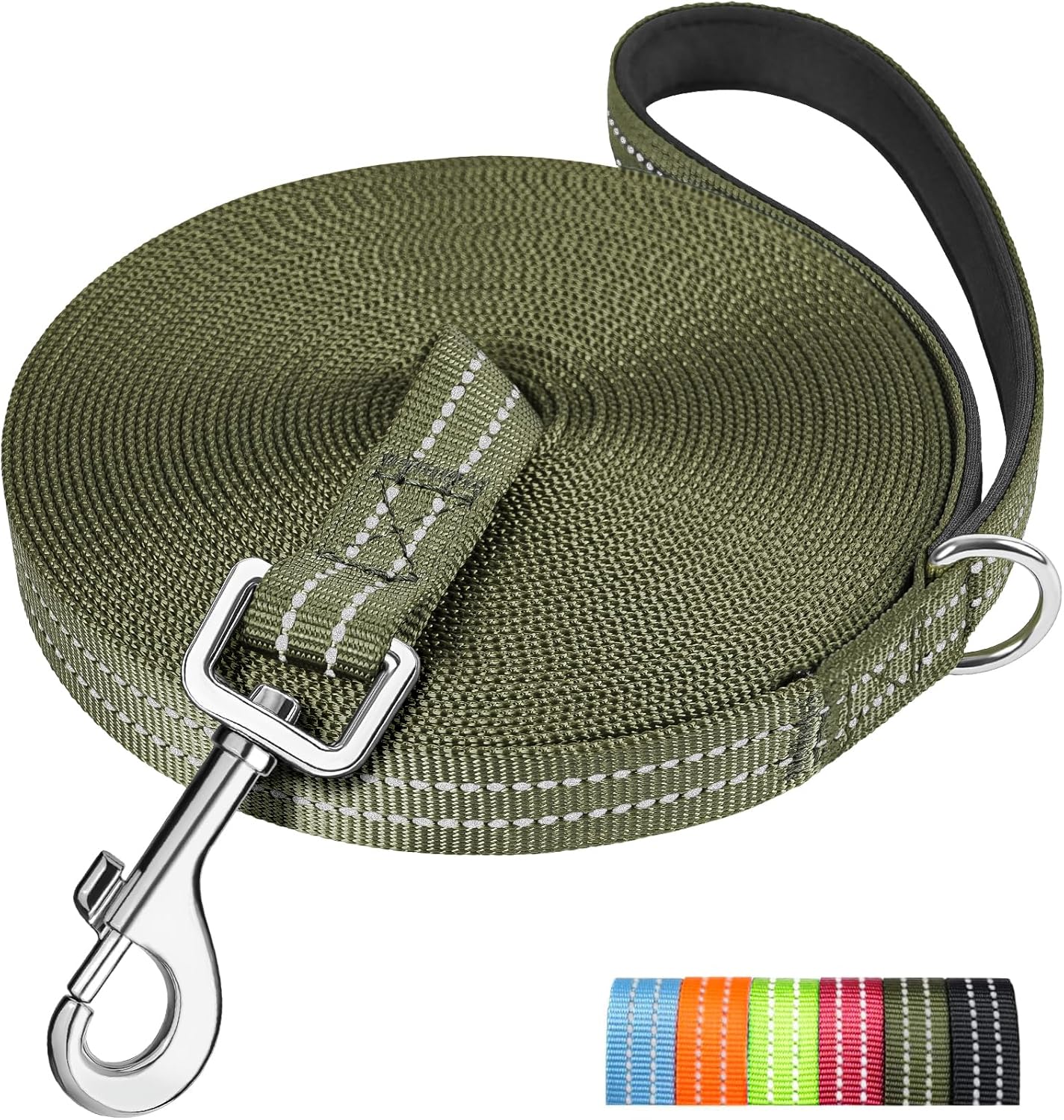The headline features are fairly clear: multiple lengths (3m, 5m, 10m, 15m, 20m, 25m, 30m), reflective threads for low-light visibility, and a soft padded handle meant to reduce hand discomfort if your dog surges forward.
