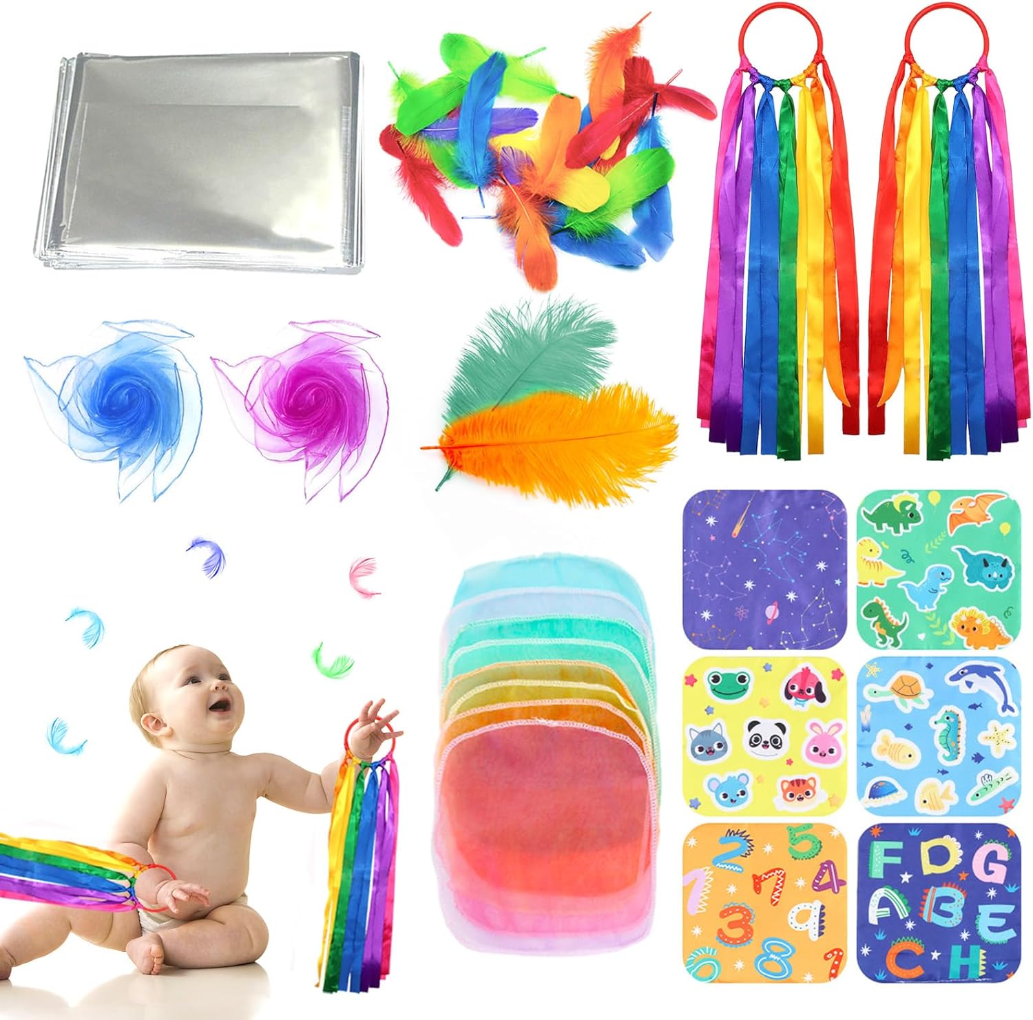 Use individual items for short sensory play sessions on a clean surface, alternating textures and sounds to keep attention. Supervise all interactions and introduce single pieces first to monitor reaction, especially with newborns. It’s a good idea to include the scarves and feathers in gentle parent‑led games to strengthen bonding and encourage reaching and grasping.