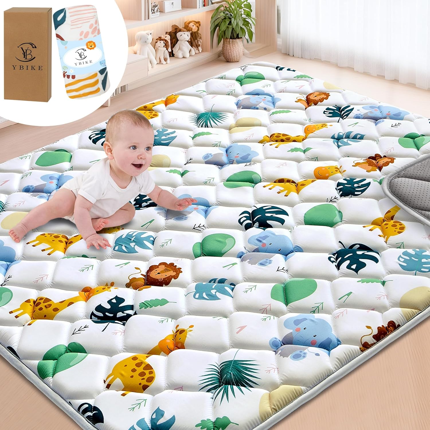 A generously sized, foldable play mat from YBIKE that combines soft cotton blend surface and a thick padded core to provide a comfortable area for tummy time, crawling and family play. The non-slip underside helps keep the mat in place on hard floors, while reinforced stitched edges aim to extend useful life. The digital animal print adds a playful touch that stays vivid according to the manufacturer, and the mat packs flat for storage or portable use outdoors.