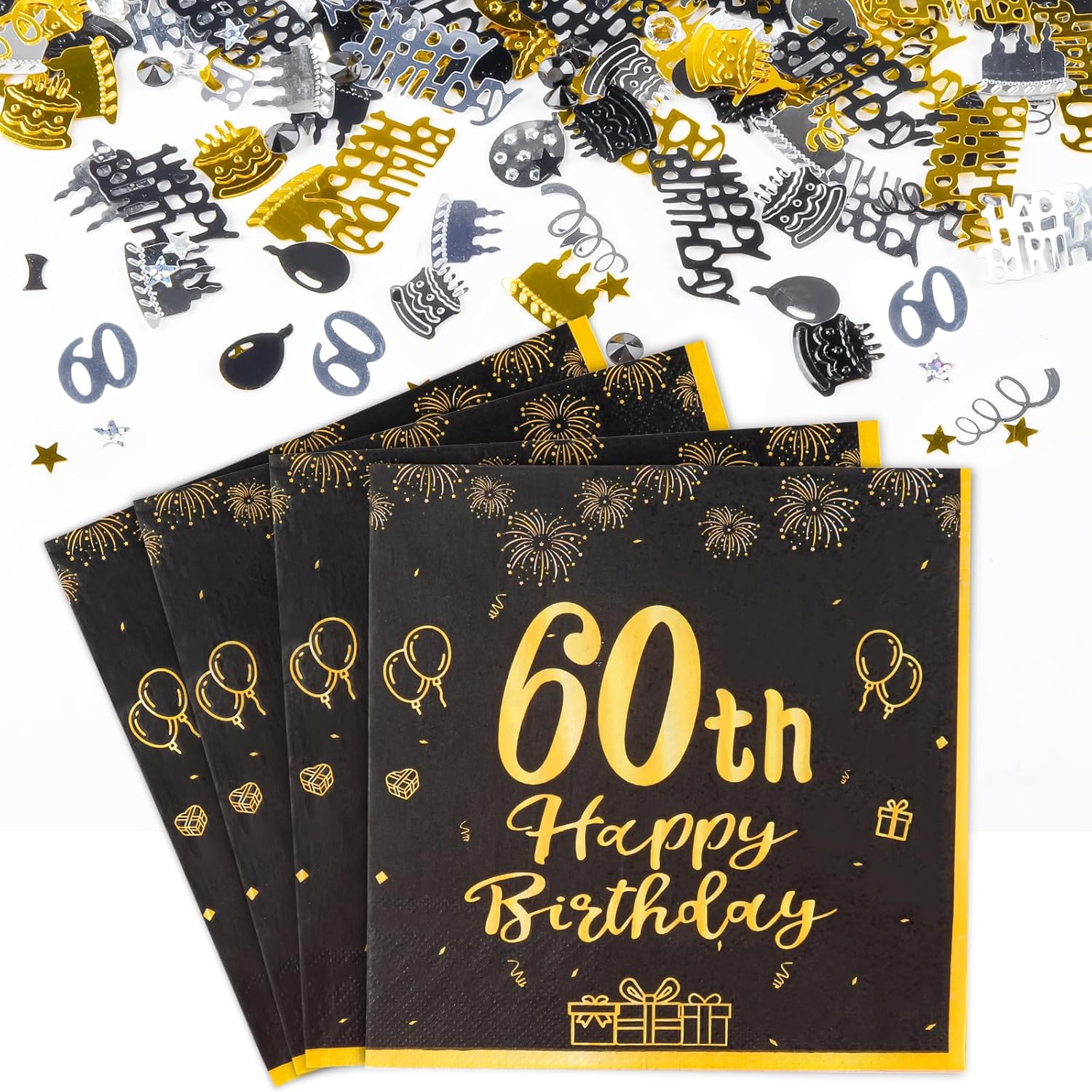 For the confetti, the “black background + gold” theme on the napkins is a good match with the confetti colours listed (silver, gold and black). So if you want a look that feels more grown-up for a 60th birthday, the palette fits.