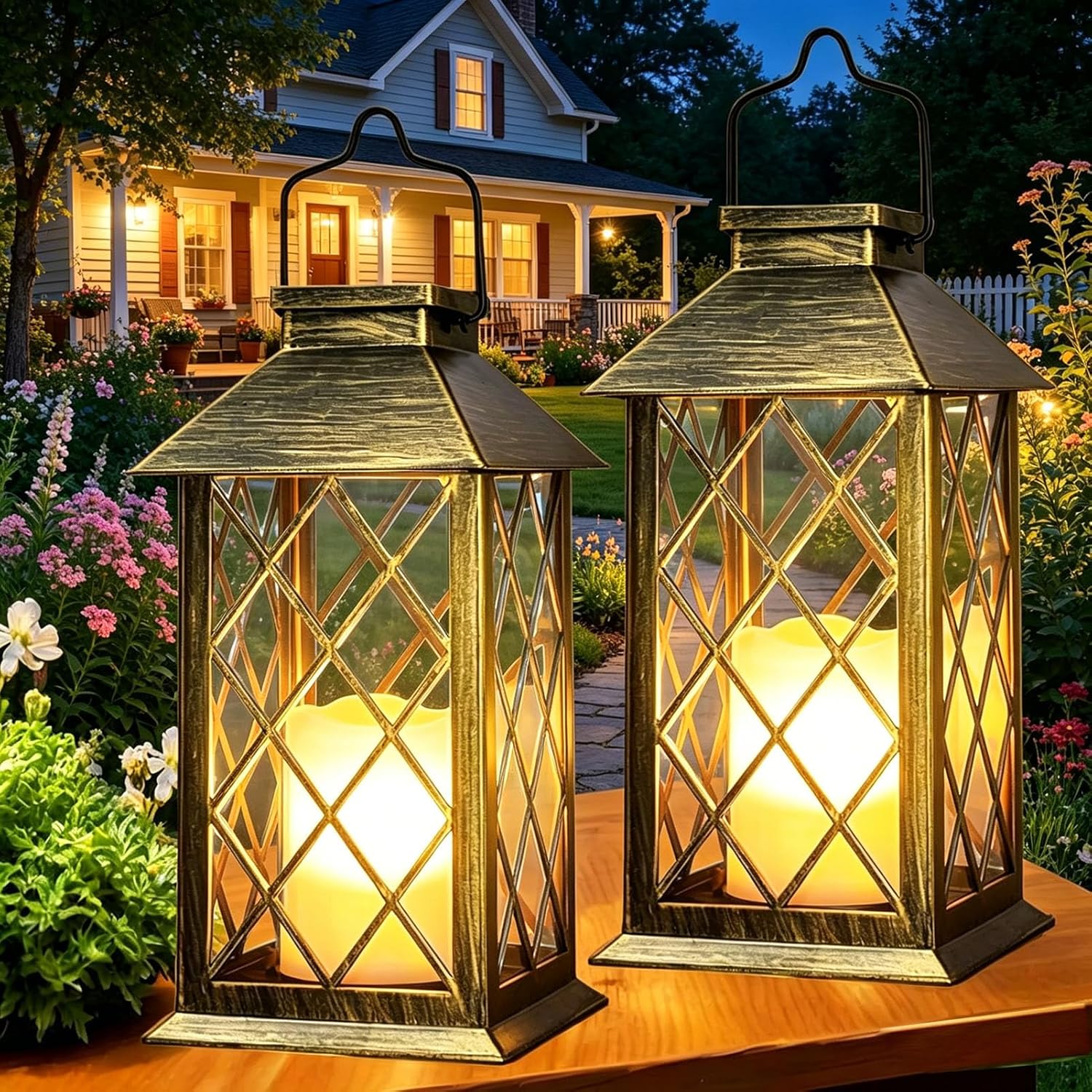 - BUCASA Solar Lights Outdoor Garden – 2-pack metal lanterns with chain and hook for hanging décor
