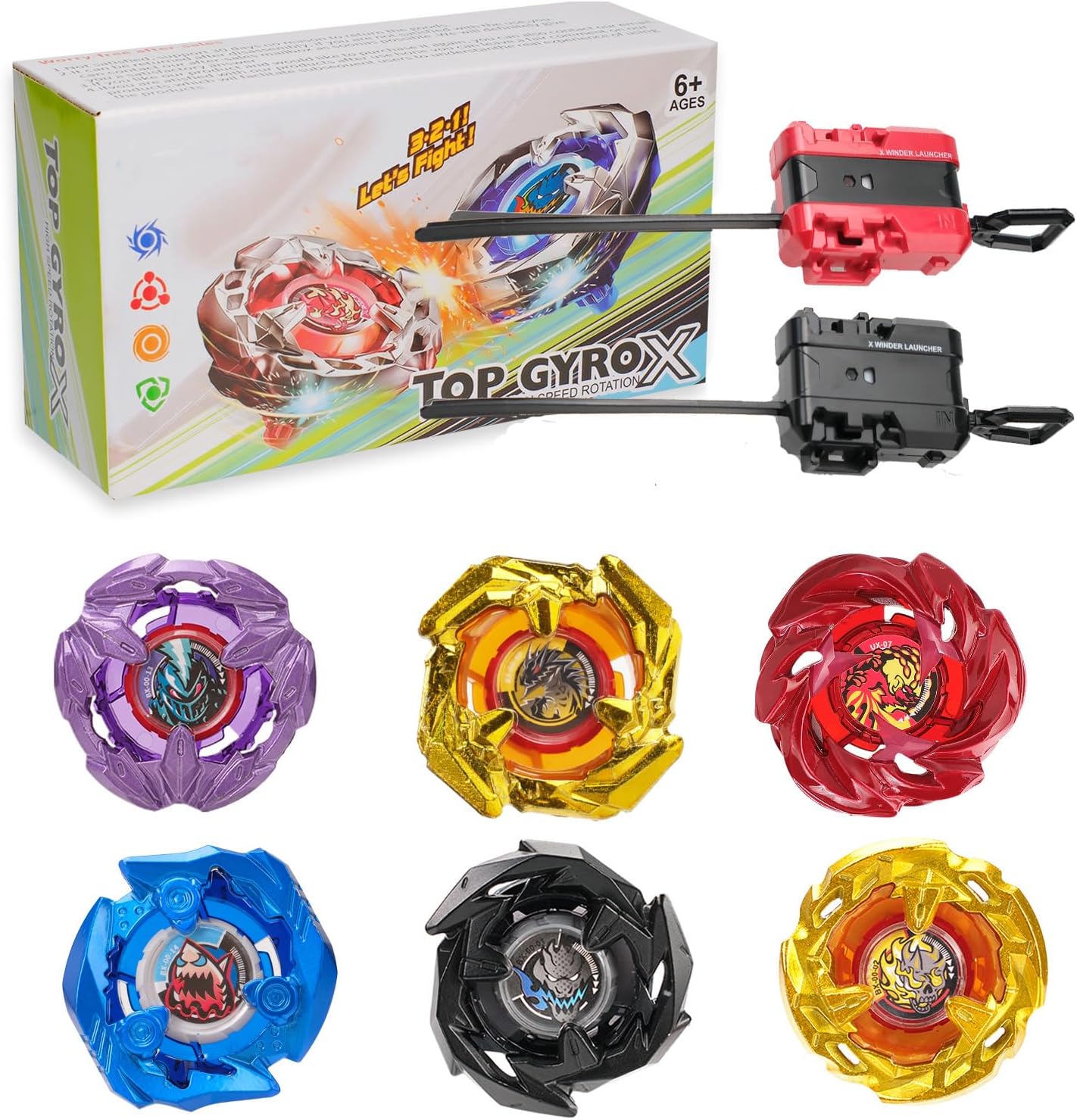 DEZAWRTY Gyro X Battle Set: 6 high-speed spinning tops and 2 X launchers starter...