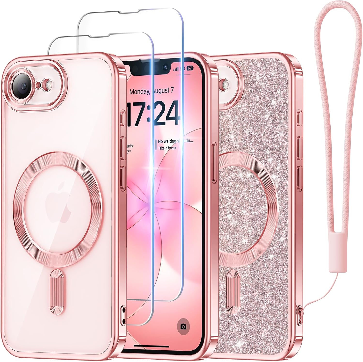 Meifigno Designed for iPhone 17e/16e Case (6.1") with MagSafe, Glitter Card & Wrist Strap, Rose