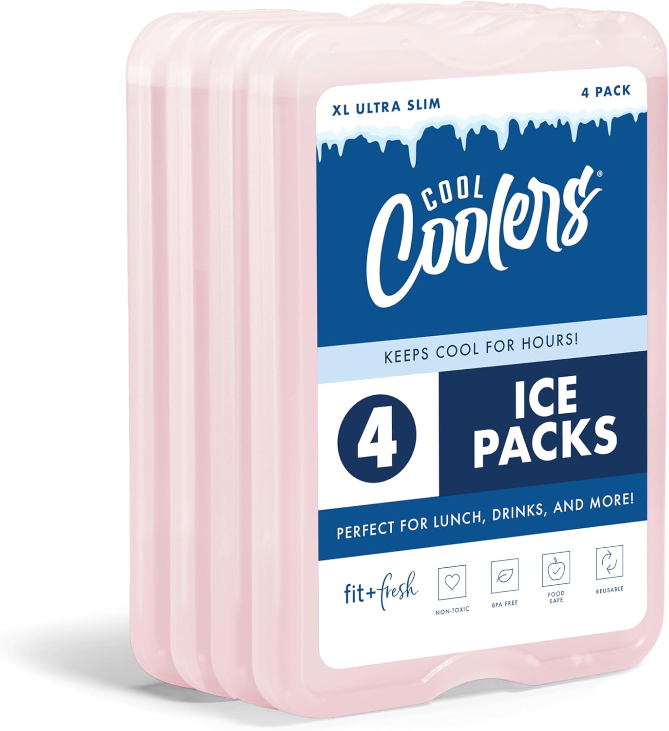 Fit & Fresh Cool Coolers XL Slim Ice Packs (4Pk) – Quick-Freeze Reusable Lunch Cooler Packs, Space-Saving, Light Pink
