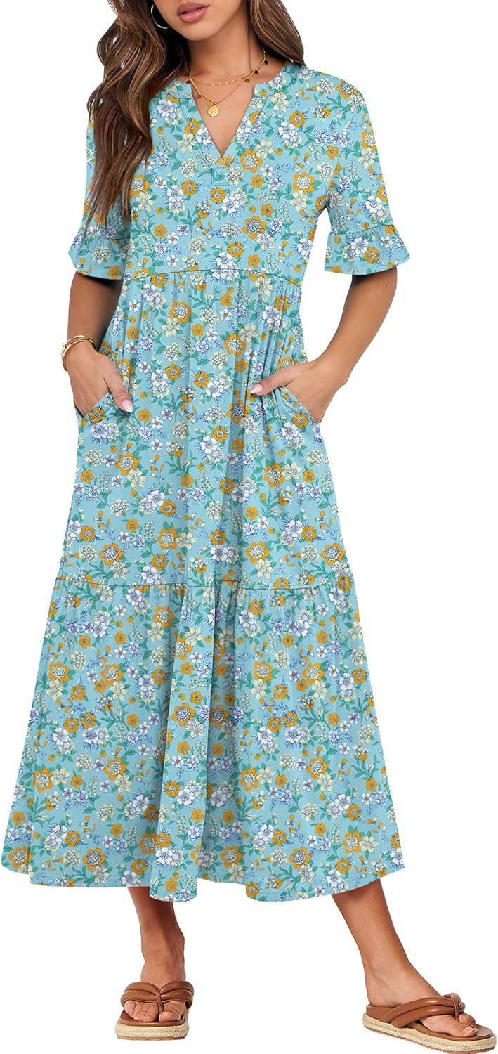 The ANRABESS Women’s Summer Maxi Dress is a lightweight, loose-fit maxi with a V-neck, ruffle short sleeves, and a flowy tiered silhouette. Designed for warm weather, beach days, and casual vacations, it’s shaped to drape softly over the body while maintaining enough structure to feel put-together. It’s best described as a versatile, everyday dress that leans into a boho vibe without trying too hard. If your wardrobe leans toward relaxed elegance with a touch of whimsy, this dress can slide into multiple outfits and occasions.