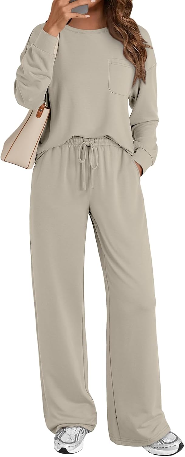 This two-piece lounge set from AUTOMET combines a relaxed silhouette and soft fabric for everyday comfort, making it a practical choice for travel, casual outings, or light workouts. The sweatshirt and wide-leg pants deliver breathable warmth and easy movement while keeping a coordinated look.