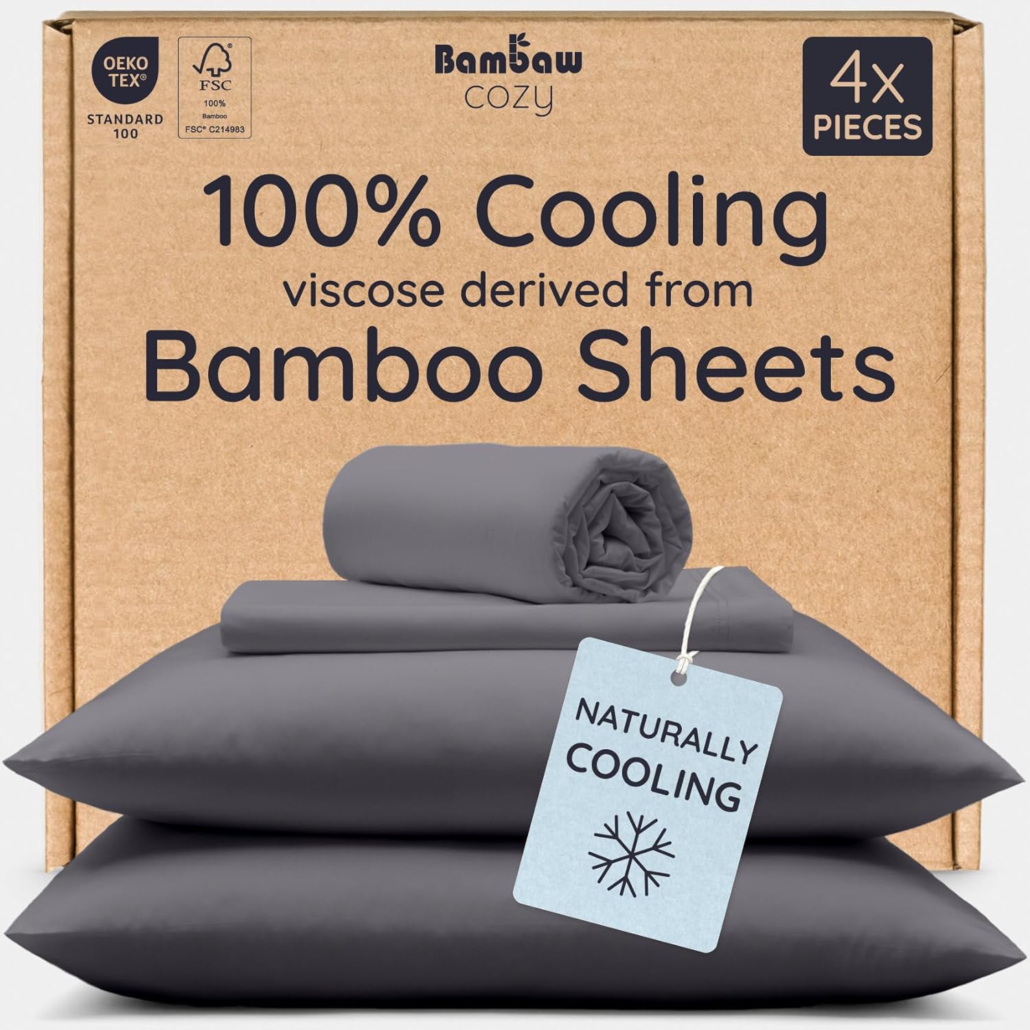 The four-piece queen set includes a fitted sheet 60" x 80", a flat sheet 90" x 102" and two pillowcases 20" x 30" with 8" envelope flaps. Certified by FSC and OEKO-TEX Standard 100, the fabric is pure viscose derived from bamboo, free of synthetic blends according to the manufacturer. Lightweight and breathable, these cooling sheets help keep you dry and comfortable all night. A practical detail: the fitted sheet fits mattresses up to 16" and has a full elastic band plus four latex-free corner straps labeled for easy setup. Note that the fabric requires gentle washing to preserve its finish, and it softens with each cycle.