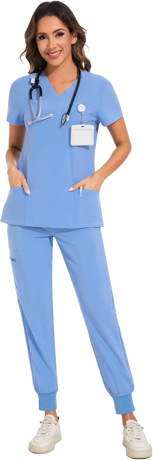 It makes sense if you want a women’s scrub set that prioritizes pocket organization, stretchy comfort, and a jogger-style pant with a yoga waistband.