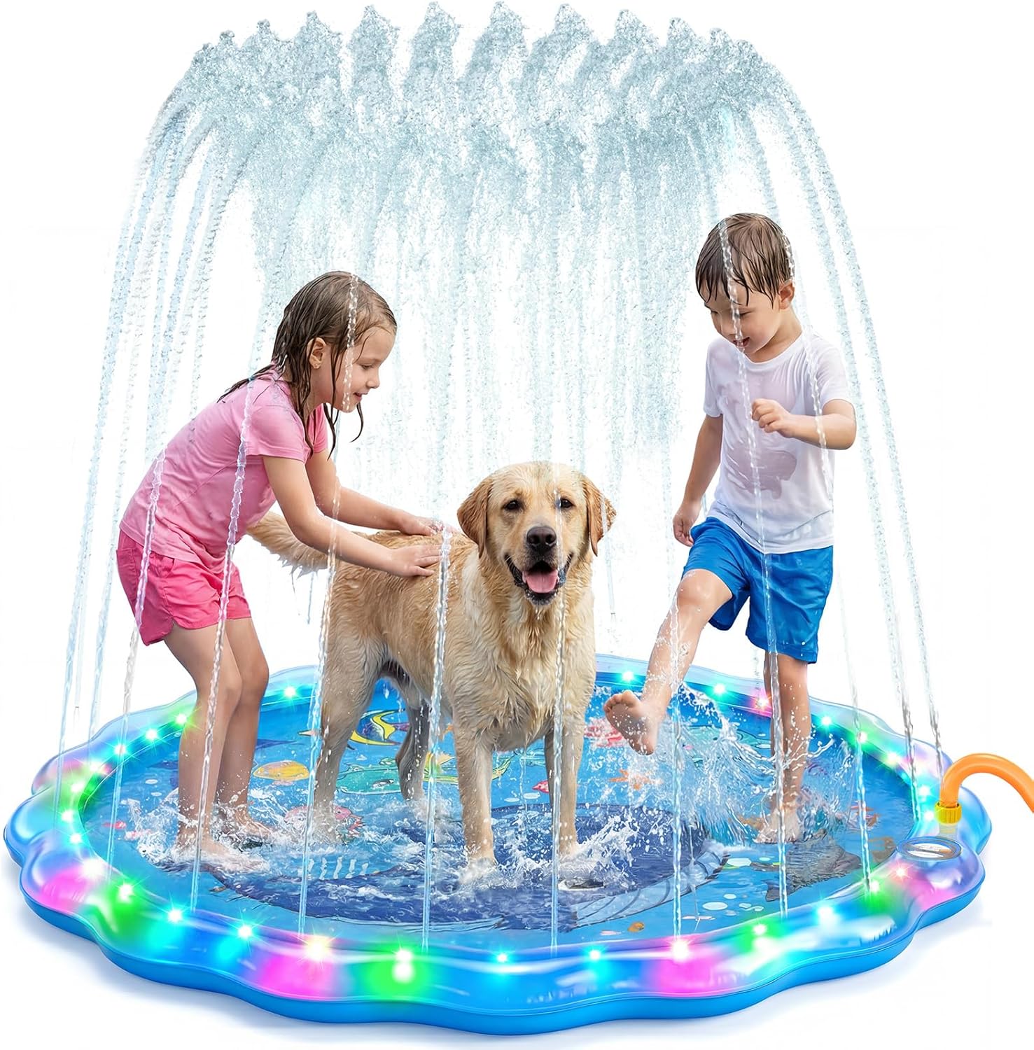 It’s an outdoor splash sprinkler play mat designed to help kids cool off and stay active in warm weather, while the RGB glow lights add a more immersive visual experience.