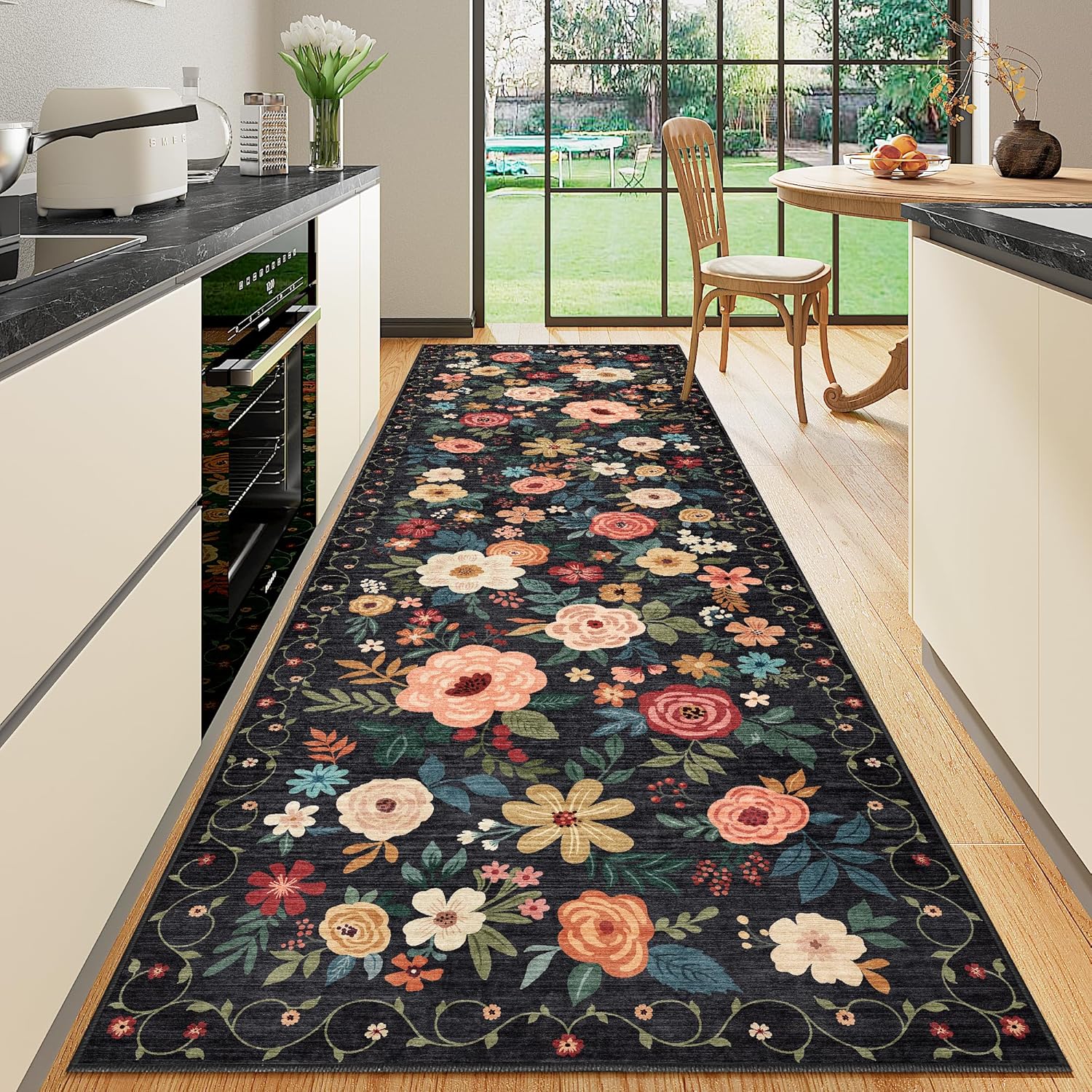 With a vintage floral motif in black, it’s positioned to complement a variety of interior styles while adding a cozy, artsy vibe. In terms of placement, the 2x10 kitchen runner format is especially useful along longer sight lines—hallways, entrances, or the stretch between a kitchen doorway and a seating area.