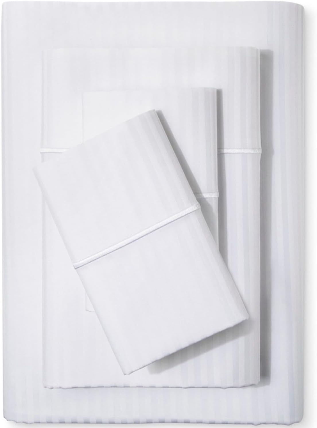 This is a 4-piece set made for a California King mattress with 18-inch deep pockets, including a fully elasticized fitted sheet, a flat sheet, and two king-size envelop pillowcases. The white stripe damask-style look is intended to read clean and elevated, especially if your bedroom leans modern, neutral, or “resort” vibes.