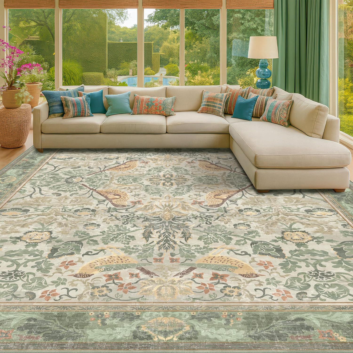 On paper it hits a nice sweet spot for high-traffic rooms. It’s a large, low-pile indoor rug in a sage green tone with a vintage-inspired floral design featuring mirrored songbirds. The appeal is as much about the look as the “make cleanup easier” idea.