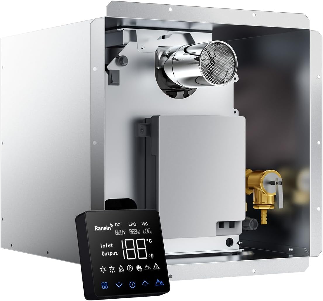 This unit replaces standard 6/10/12-gallon tank water heaters with a compact fit that matches common RV cutouts. It supports simultaneous use, meaning multiple taps and showers can run with less interruption than typical tank models. The integrated anti-freeze activation and top-mounted exhaust fan improve winter reliability, which helps cold climate travelers keep systems protected. The remote controller reports gas use, voltage and flow in real time, adding practical visibility for energy conscious users. 🔥